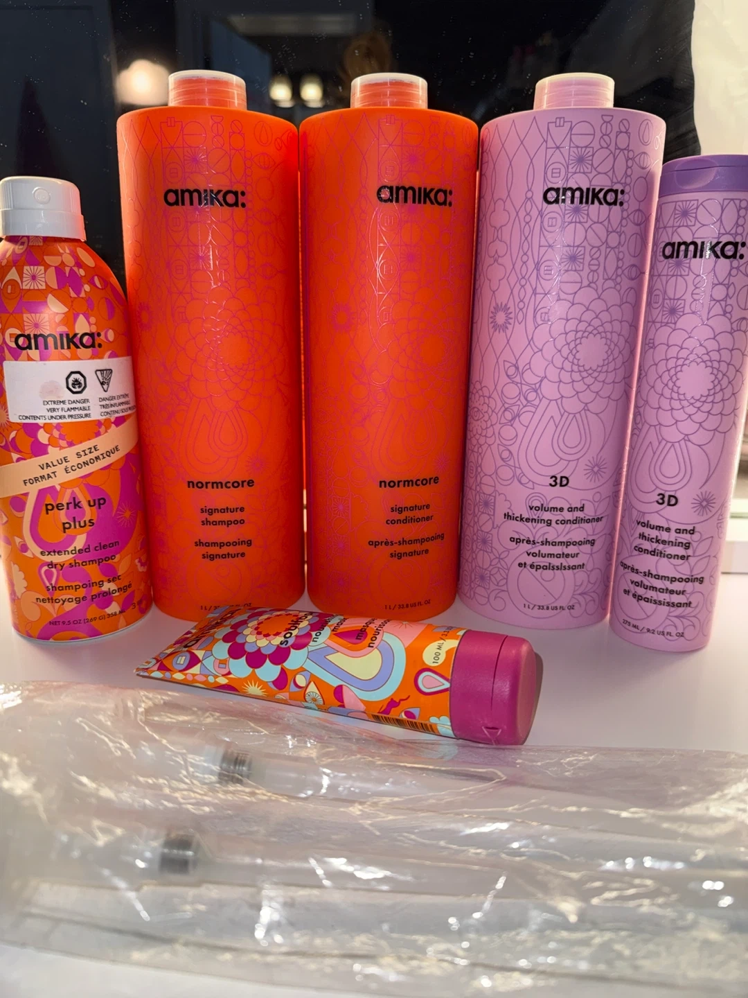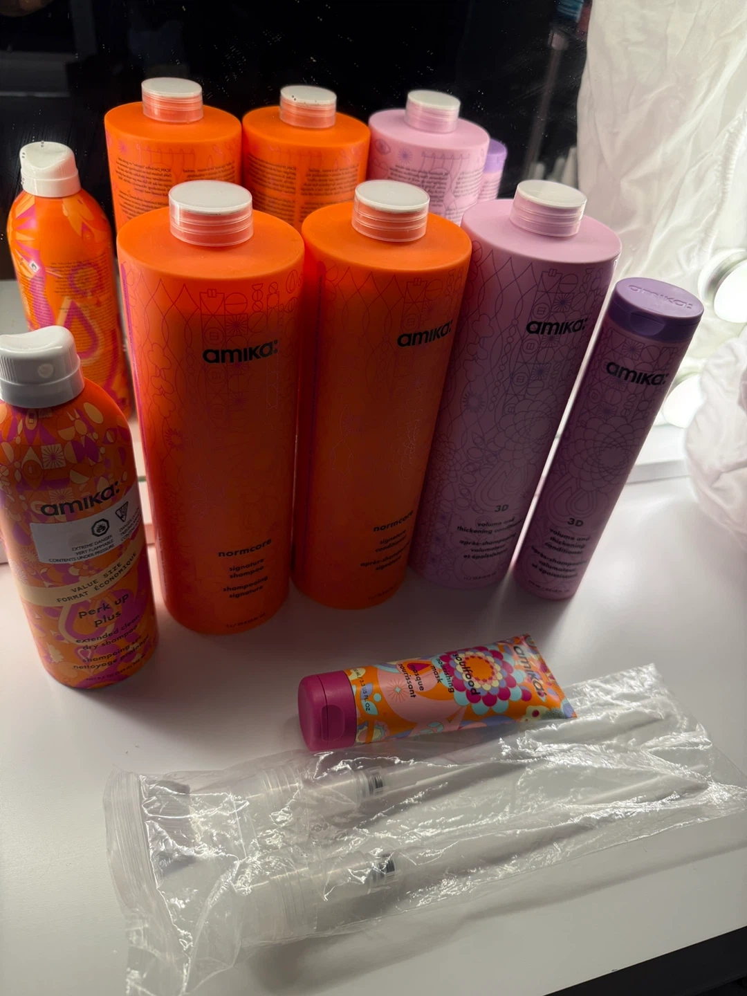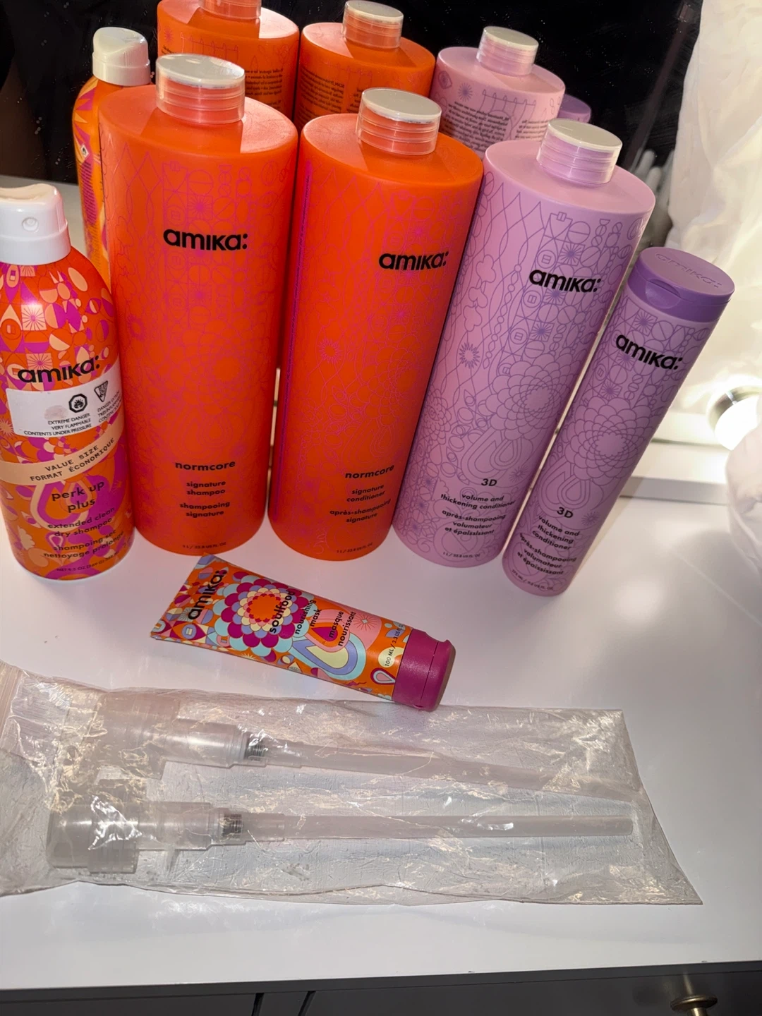 This bundle includes Amika normcore signature shampoo and conditioner, along with Amika 3D volume and thickening shampoo and conditioner. It also has an Amika Perk Up Plus Extra Volume dry shampoo and a travel-sized Kerasilk smoothing treatment. Brand new never used