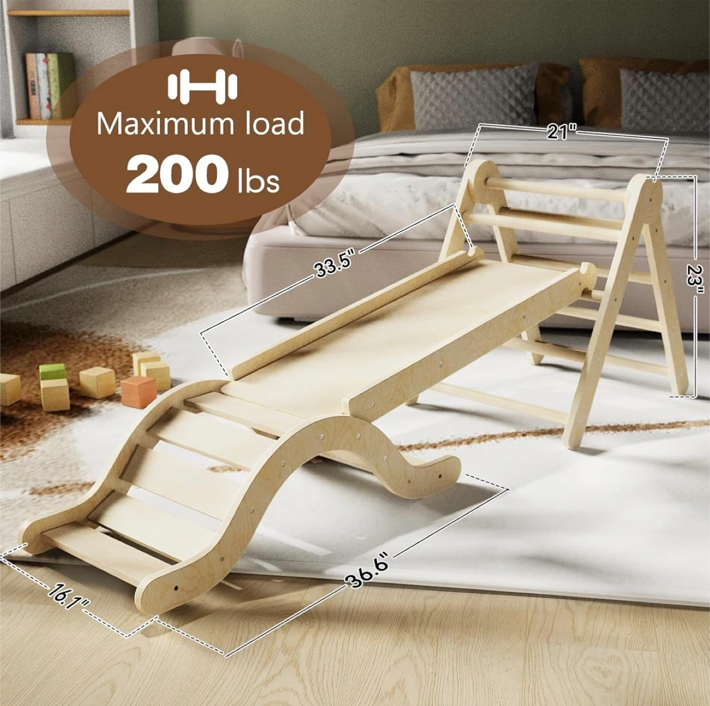 This wooden climbing set is perfect for kids! It includes a climbing arch, ladder, and slide. The ladder can be adjusted to 4 different angles for a variety of play styles. The set is designed for climbing and sliding fun, and can also be used for lounging. Maximum load is 200 lbs. Never Used, open box.