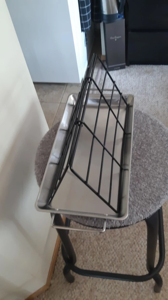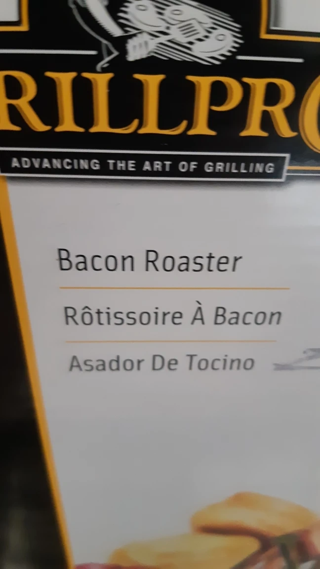 The perfect item for grilling bacon. There is a stainless steel pan. It holds a black wire rack. The rack has a curved shape. This is a great item for any cook. also comes with two salmon grilling planks