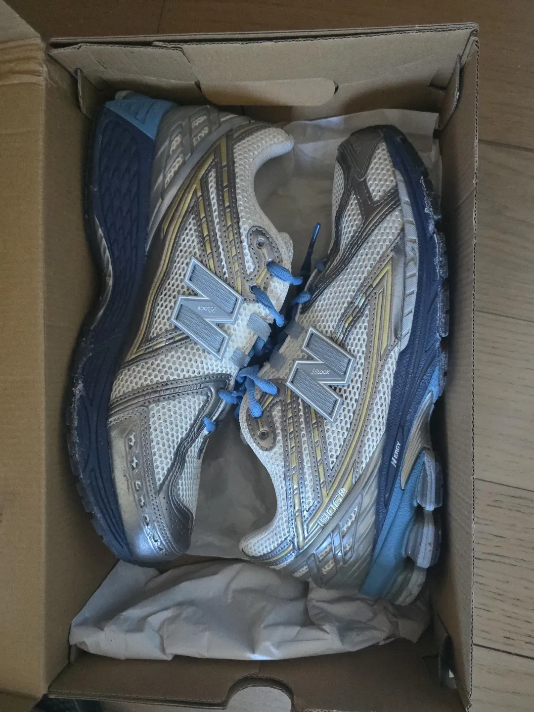 New Balance 1906R running shoes. Features a mesh and synthetic upper with N-ergy cushioning. These shoes are silver with blue accents and blue laces. Original box included.