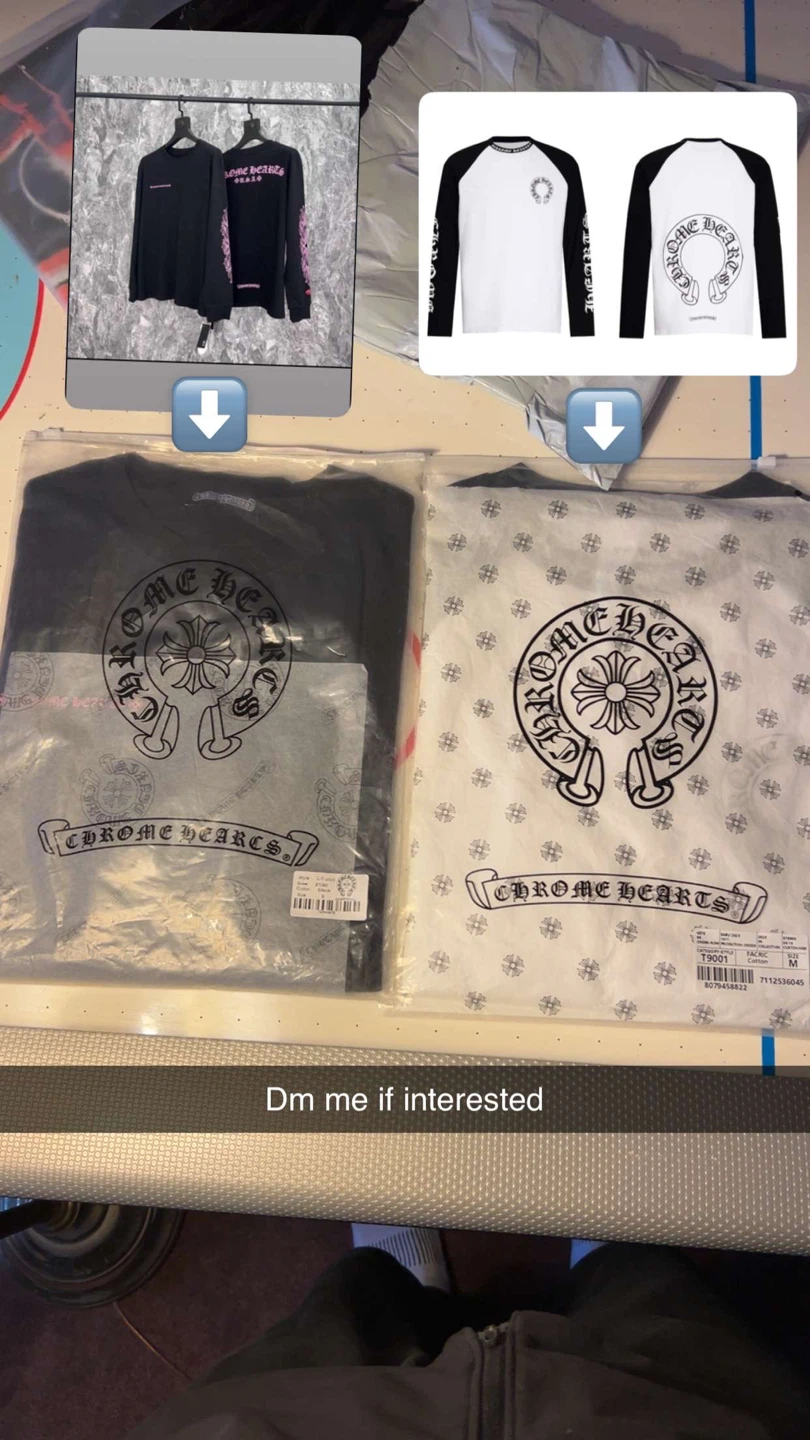 Two Chrome Hearts long sleeve t-shirts. Includes one black and one white baseball tee style shirt. Both are sealed in original packaging. Available in size M.