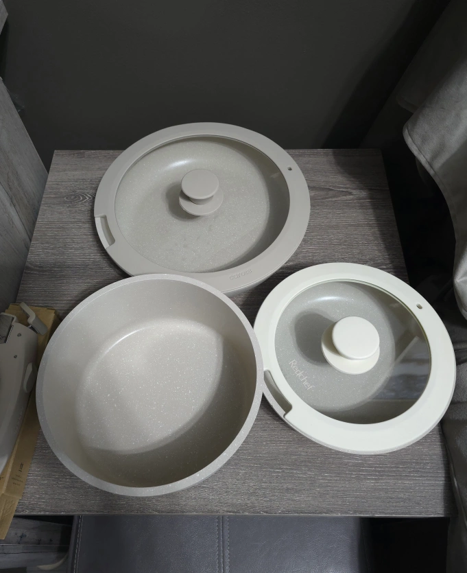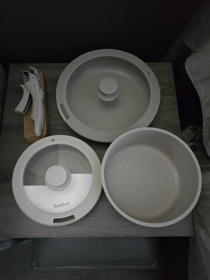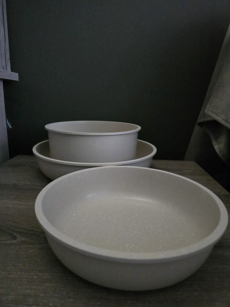 The 26cm pan was used a few times leaving some mark from overheating the food. The other two are new never used.