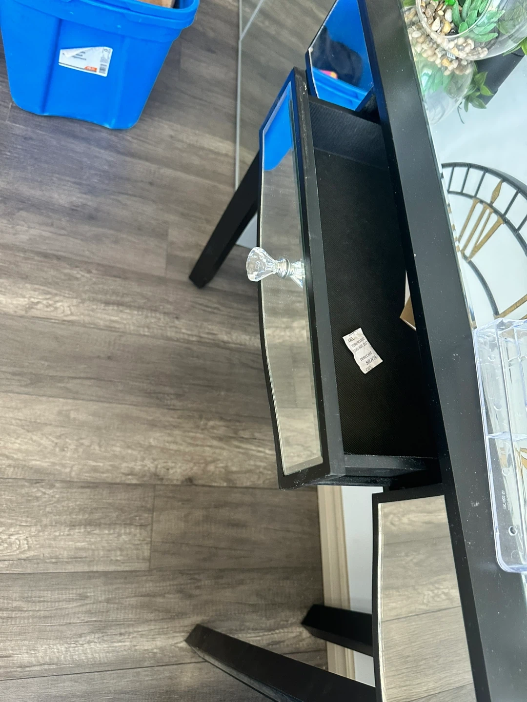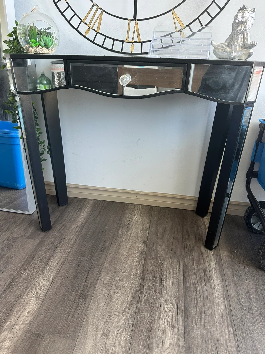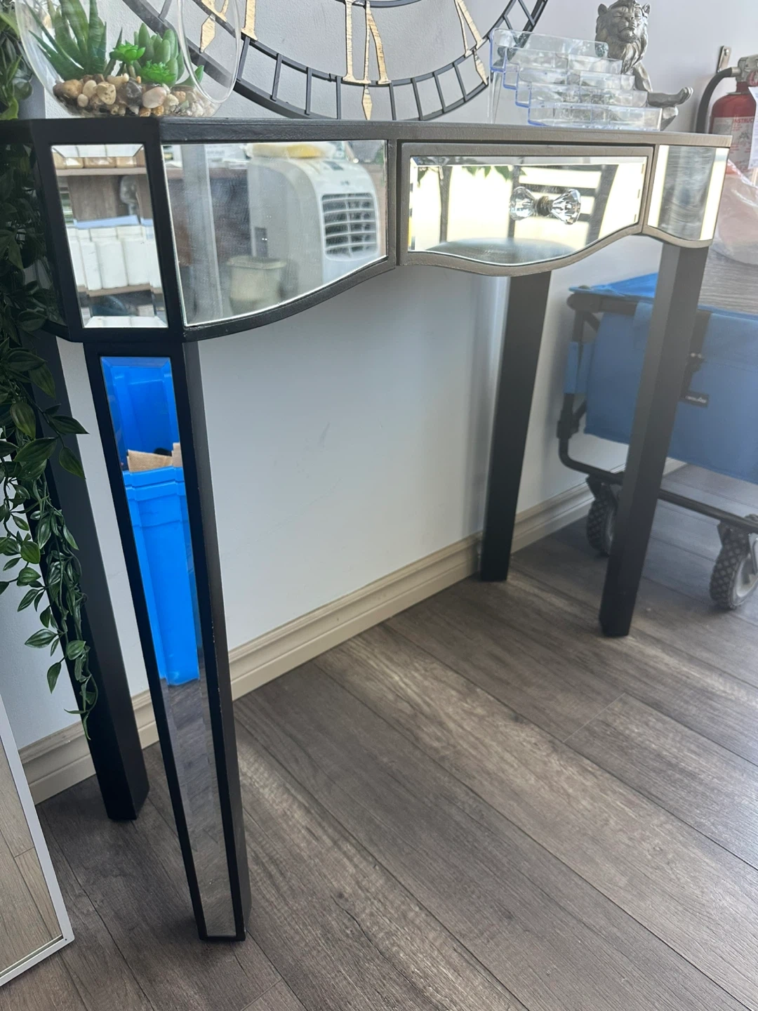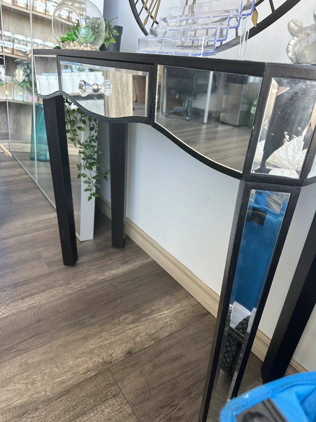 Elegant mirrored console table with a crystal knob drawer. Its reflective surfaces add a touch of glamour to any room. Tabletop has a unique wavy edge design.