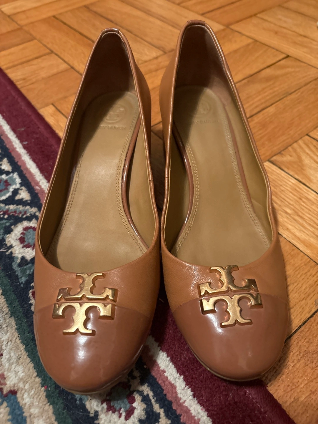 Women's Tory Burch brown leather pumps. Block heel. Size 7.5. Gold logo detail.