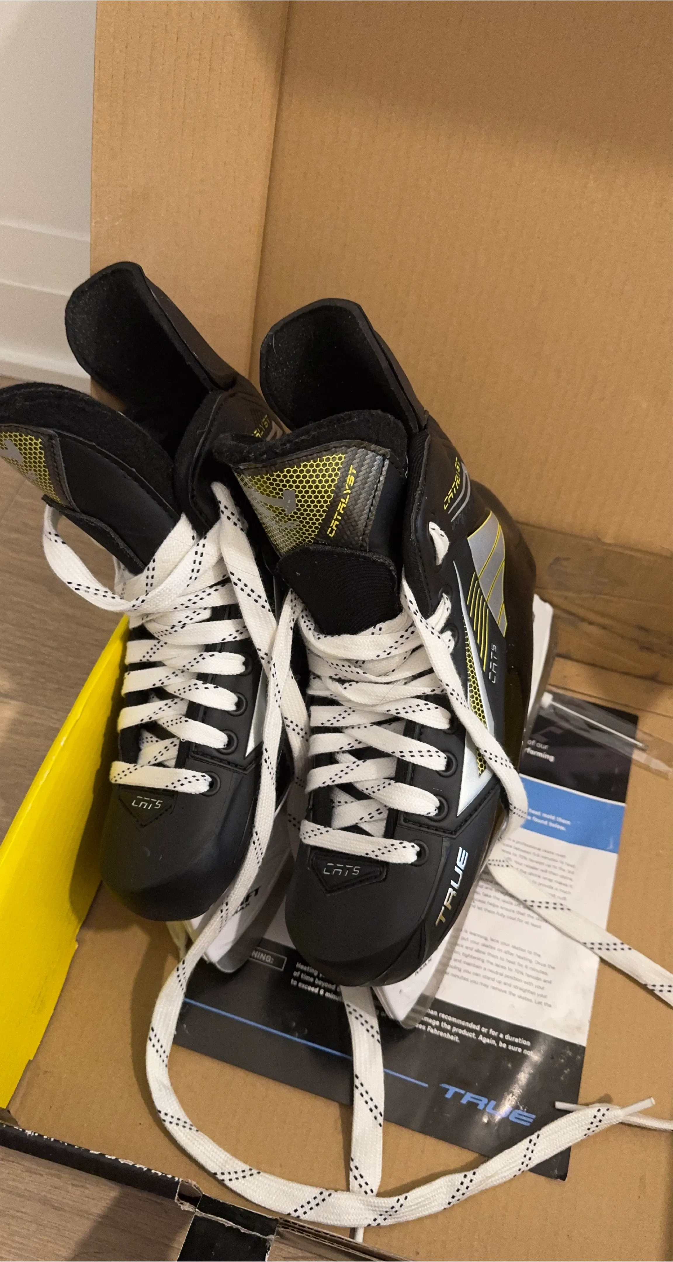 These TRUE Catalyst 7 hockey skates are black with yellow and silver accents. They feature white laces. This pair comes with the original box and instruction manual. They are ready for the ice!