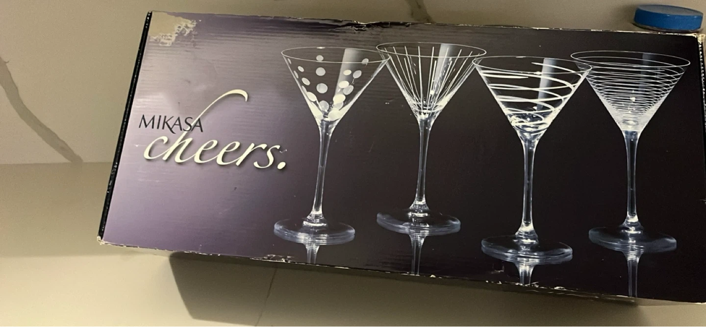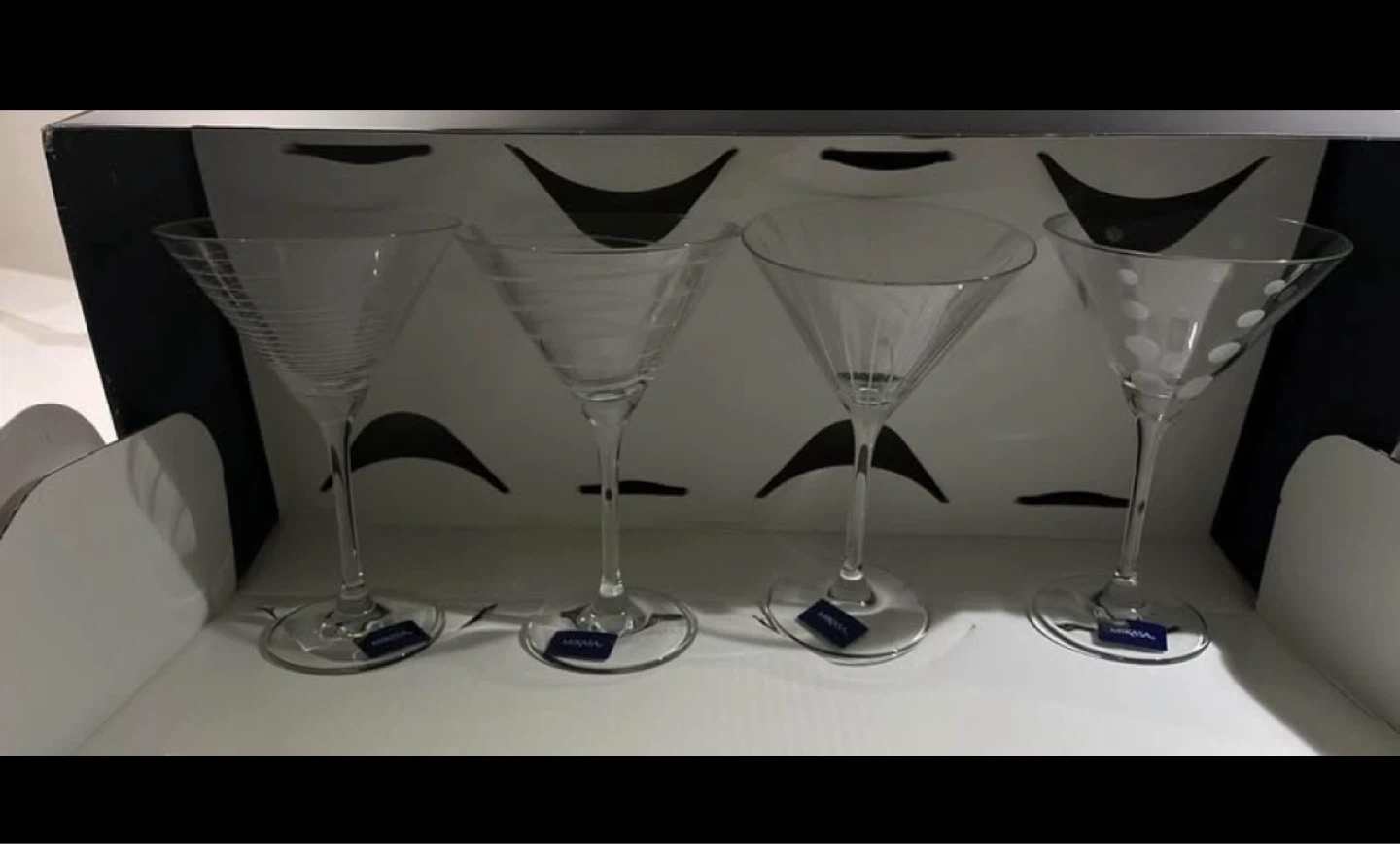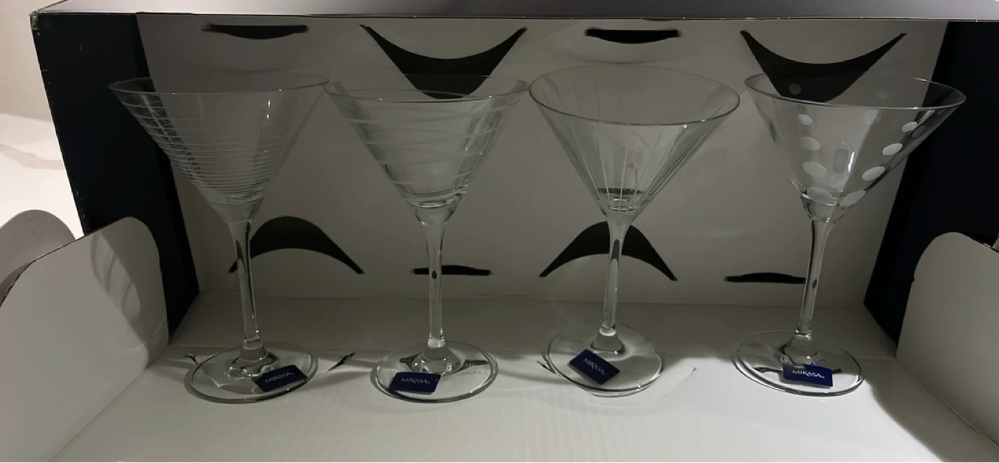 Set of four Mikasa martini glasses with distinct etched designs. Includes original packaging. Glasses are clear glass.pick up location Yonge Yonge and Drewry