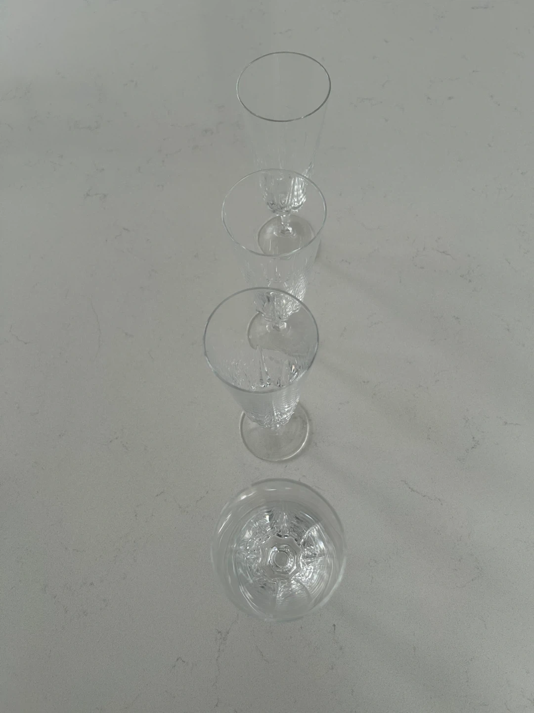 Elegant set of four clear crystal champagne flutes. These glasses have a fluted design on the bowl and a delicate stem. Perfect for celebrations or special occasions!