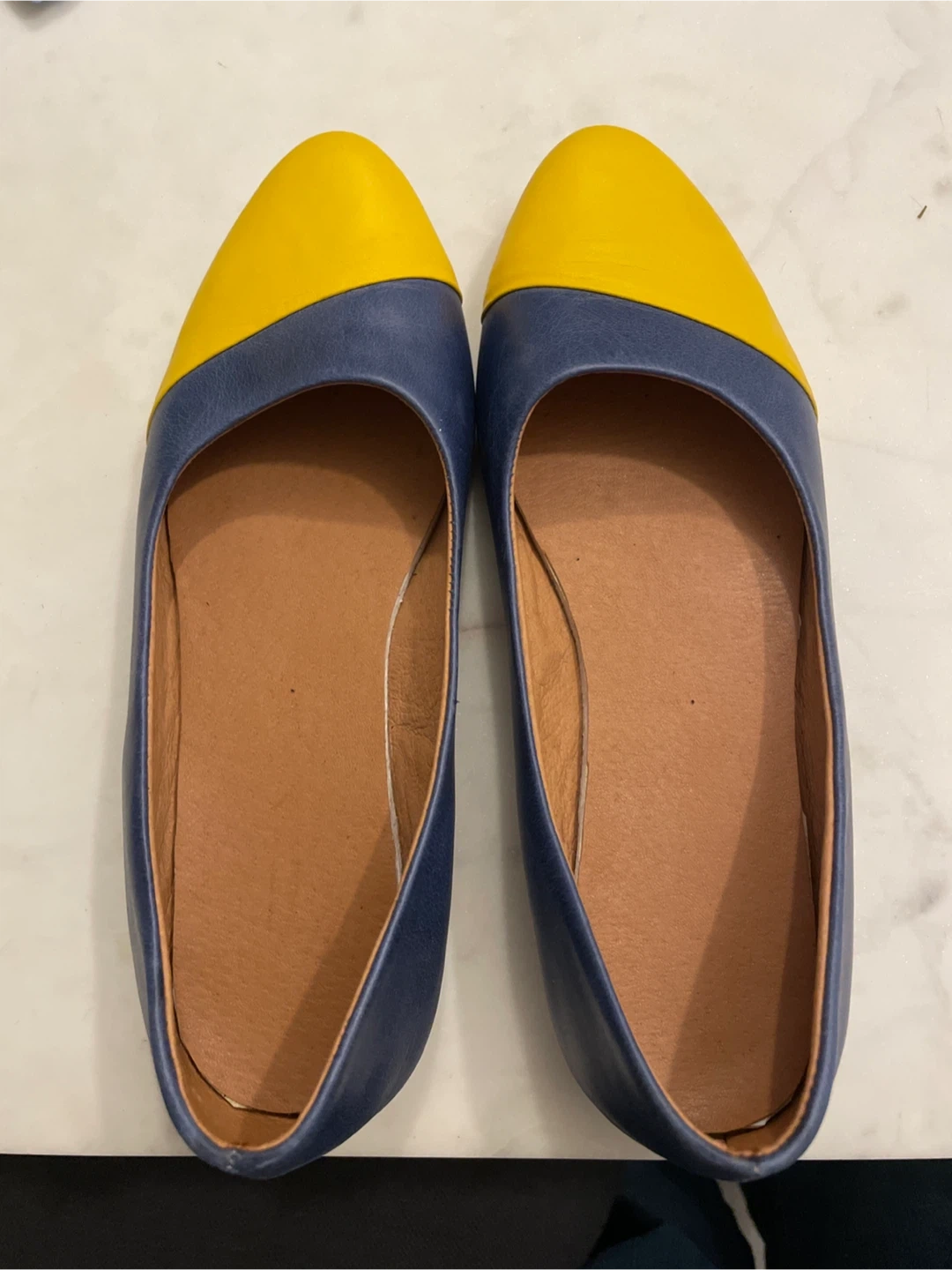 š„Leather Blue and Yellow Pointed Toe Flats sz 6