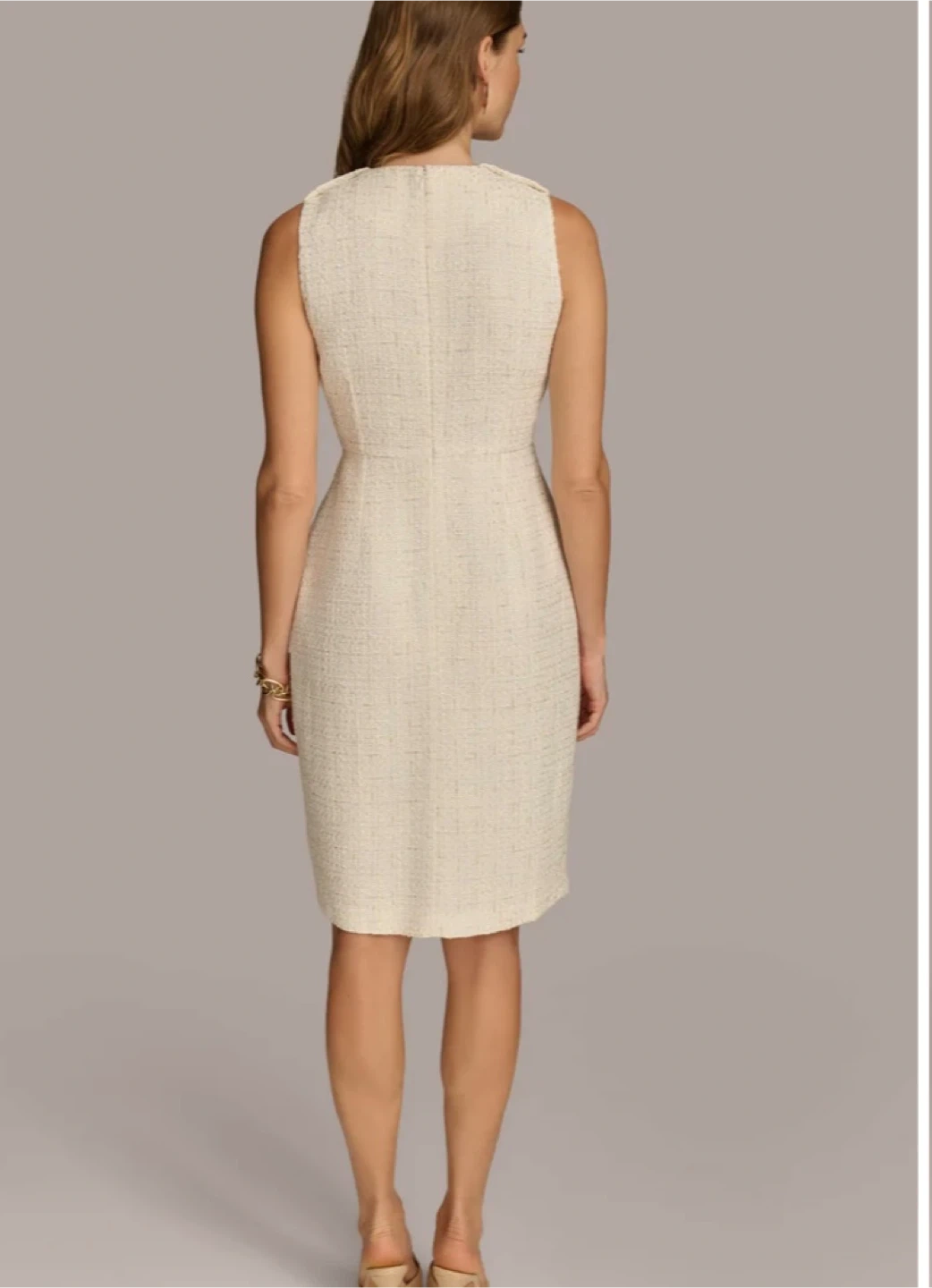 This is a Donna Karan New York sleeveless midi dress. It features a high neckline, hardware button details, pleating at the front, and side slits. The dress is made from tweed fabrication and is a size 6. It has a classic silhouette, perfect for a 9-to-5 wardrobe!