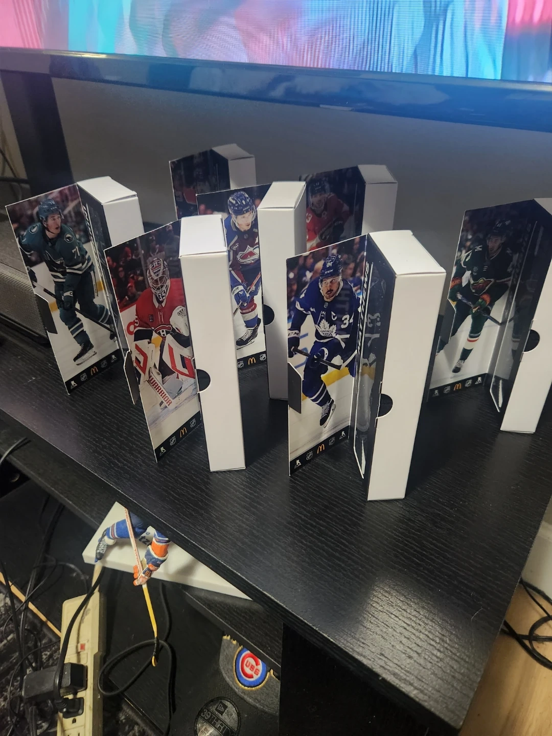 Collection of McDonald's themed hockey trading card display boxes. Each box features a different player. Boxes are white with player images on the front. Full Set $50