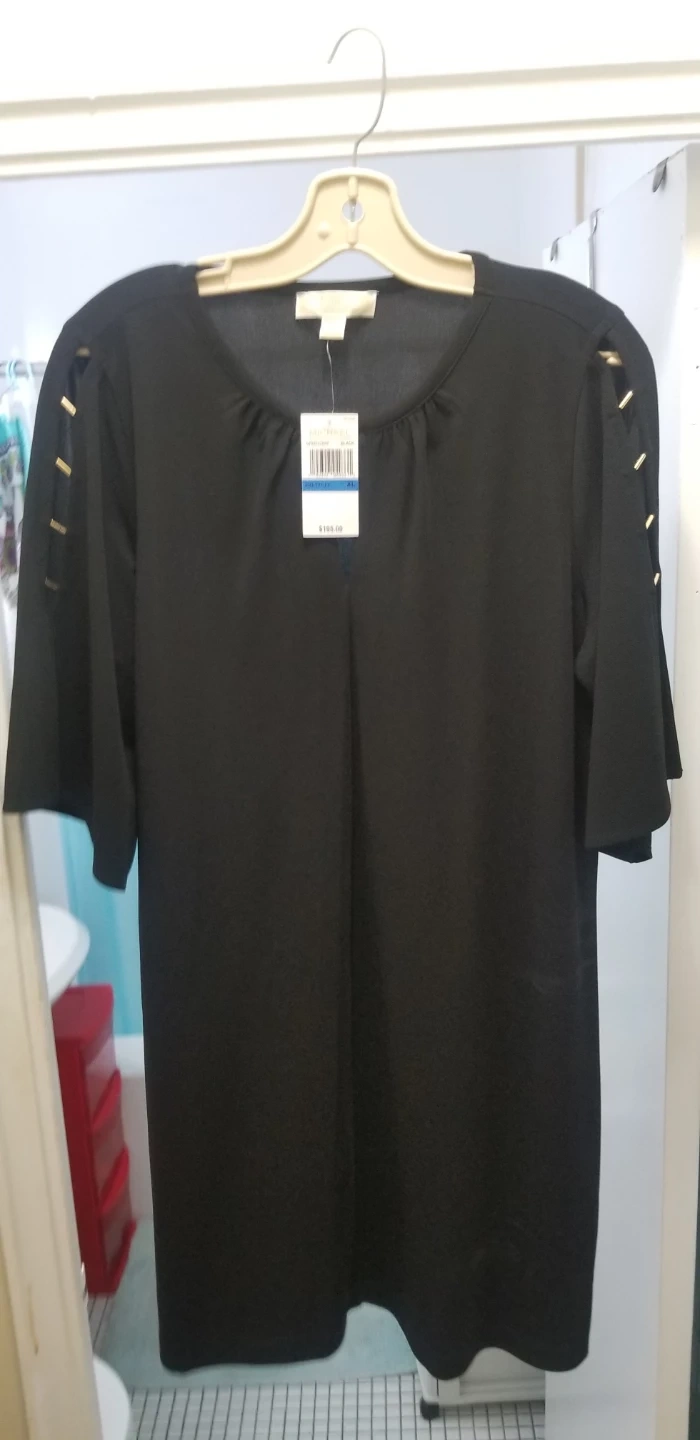 A Michael Kors black dress with unique gold hardware accents on the sleeves. It features a flattering neckline and a flowy silhouette. This stylish dress is perfect for an evening out! Size XL brand new with tags never worn original price $195.00.