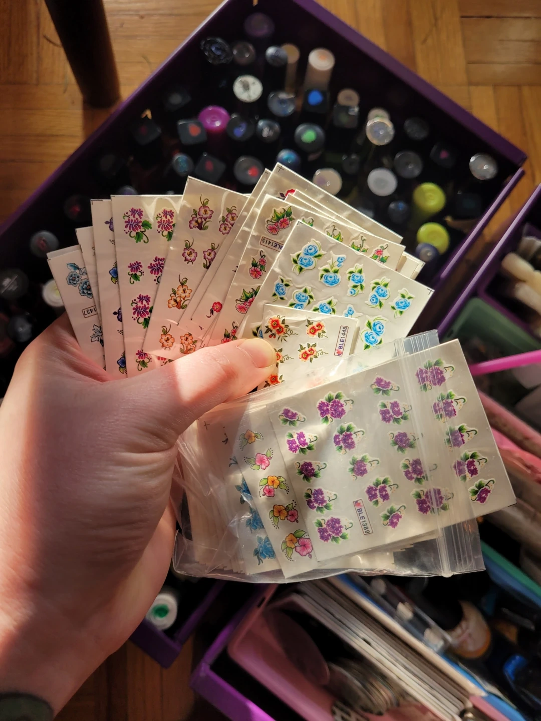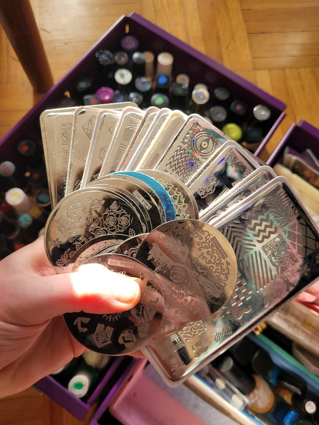 100+ nail polishes, 30+ stamping plates, hundreds of waterslide decals, stickers, gems, shimmer powders, etc, swatch sticks, you name it.