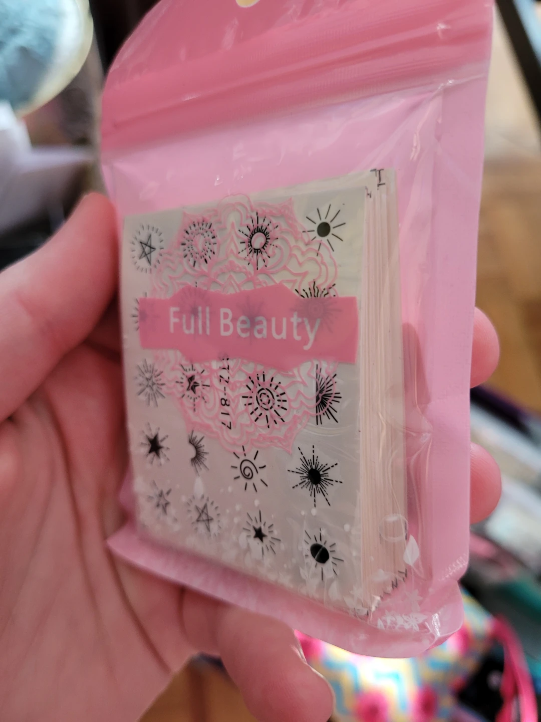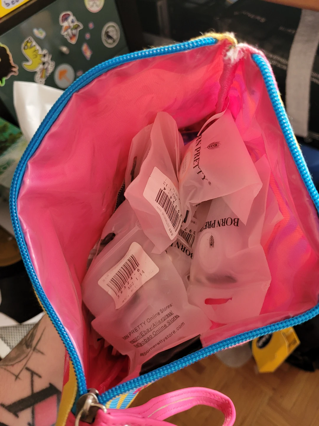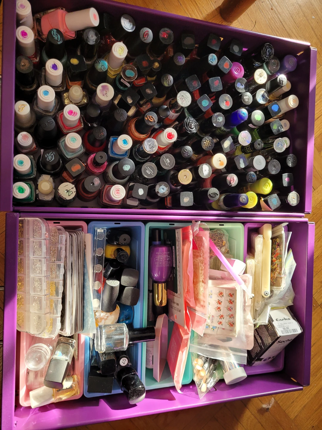 100+ nail polishes, 30+ stamping plates, hundreds of waterslide decals, stickers, gems, shimmer powders, etc, swatch sticks, you name it.