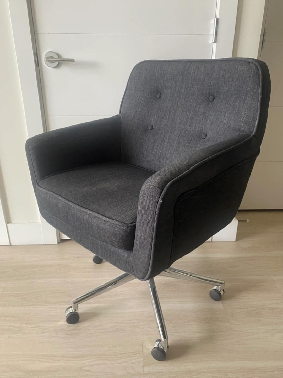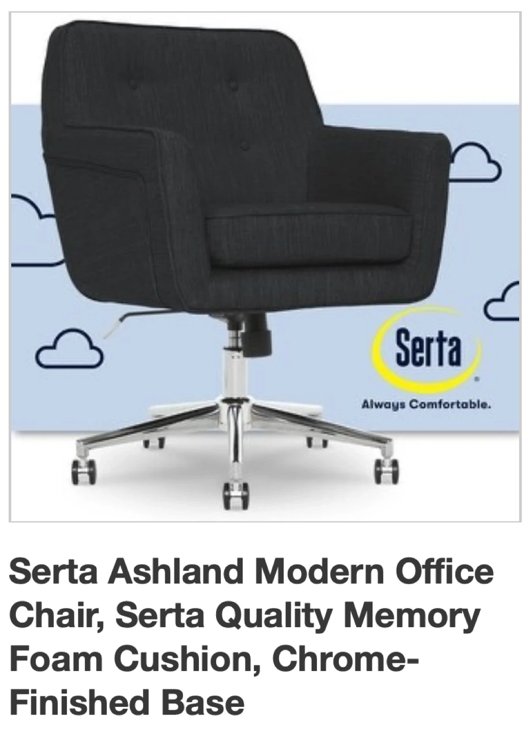 Serta Ashland Modern Office Chair with Serta Quality Memory Foam Cushion. It has a chrome-finished base and wheels for easy mobility. This chair is upholstered in a dark grey fabric.