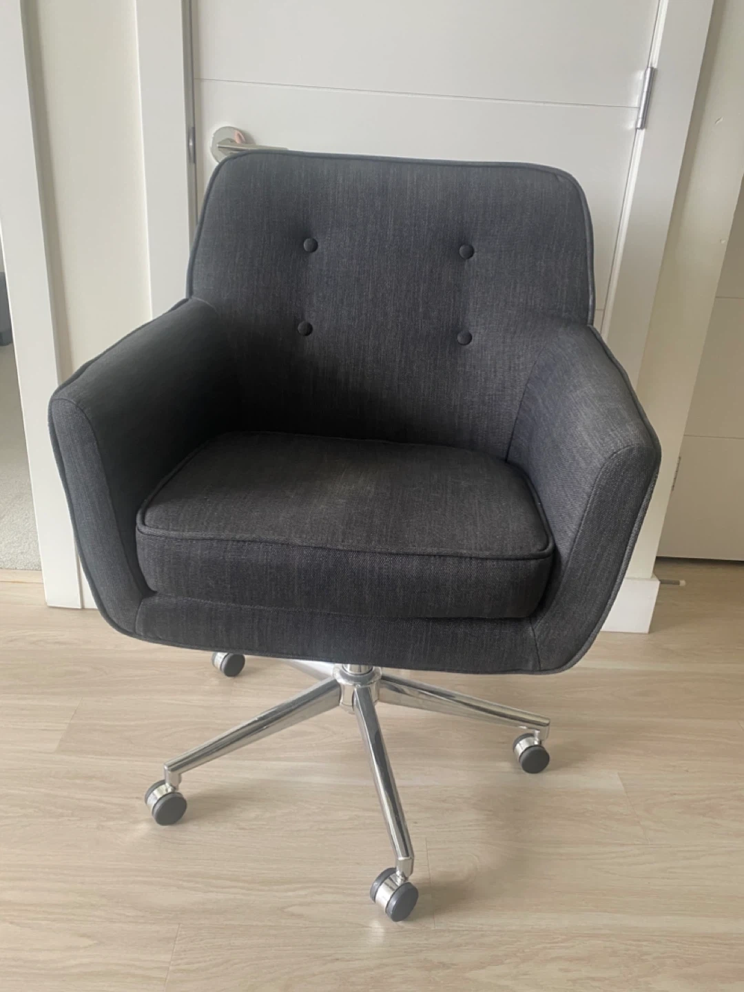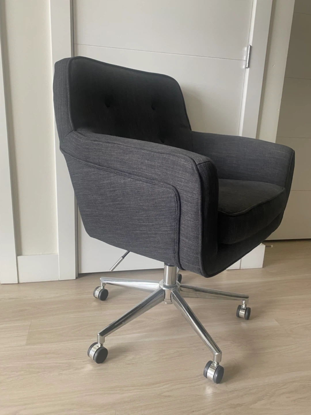 Serta Ashland Modern Office Chair with Serta Quality Memory Foam Cushion. It has a chrome-finished base and wheels for easy mobility. This chair is upholstered in a dark grey fabric.