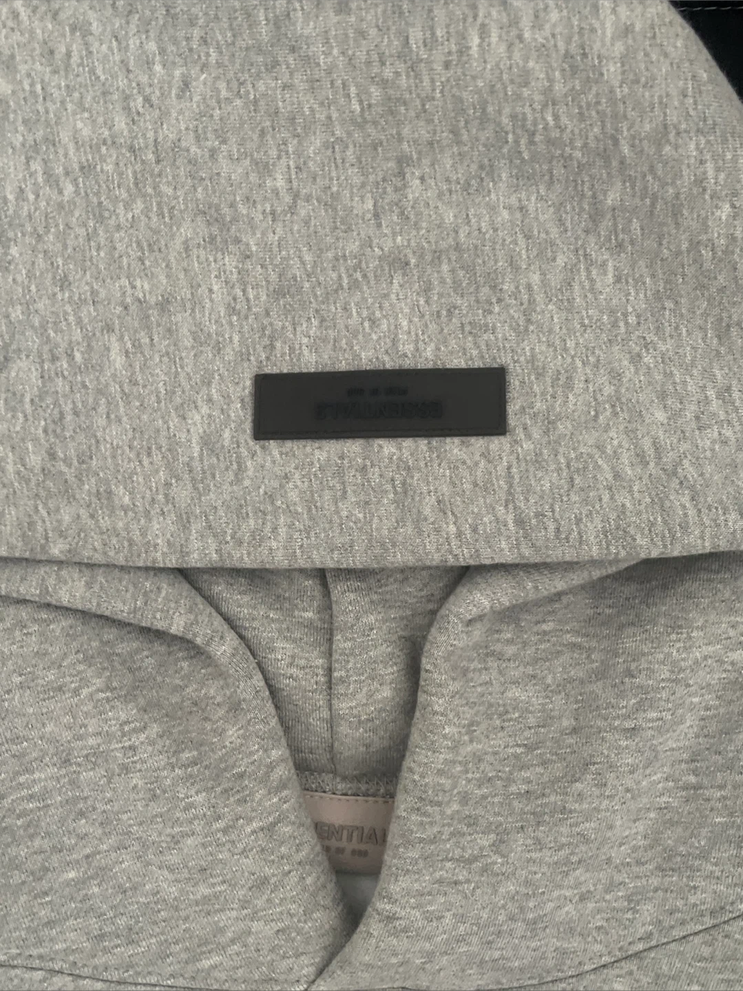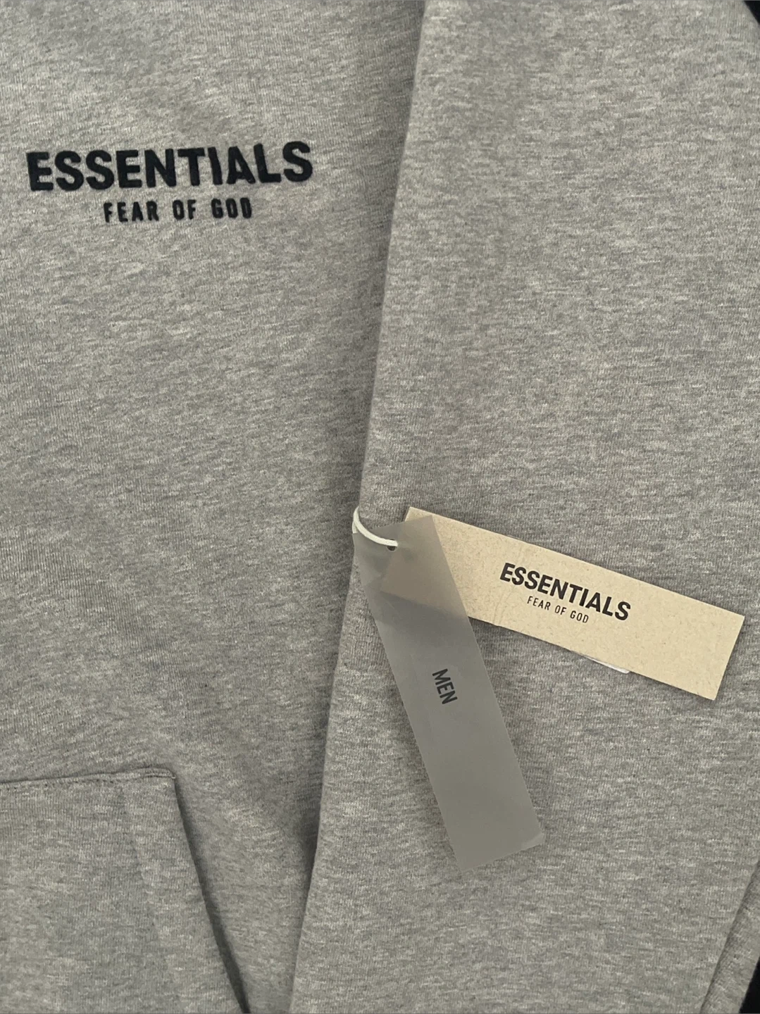 brand new Essentials Fear of God hoodie! It's a comfy grey colour and has the Essentials logo on the front and back. Perfect for staying cozy!