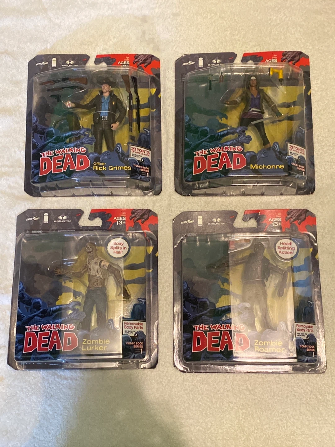 This bundle includes McFarlane Toys The Walking Dead action figures: Officer Rick Grimes, Michonne, Zombie Lurker, and Zombie Roamer. Figures are for ages 13+ and come in original packaging. Some figures feature removable body parts and articulation points.