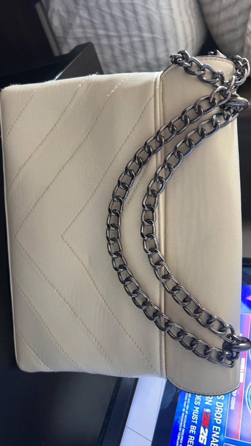 This is a stylish cream shoulder bag by Yves Saint Laurent. It features a metal chain strap and a tassel accent. The bag has multiple zippered compartments inside, making it functional for everyday use.