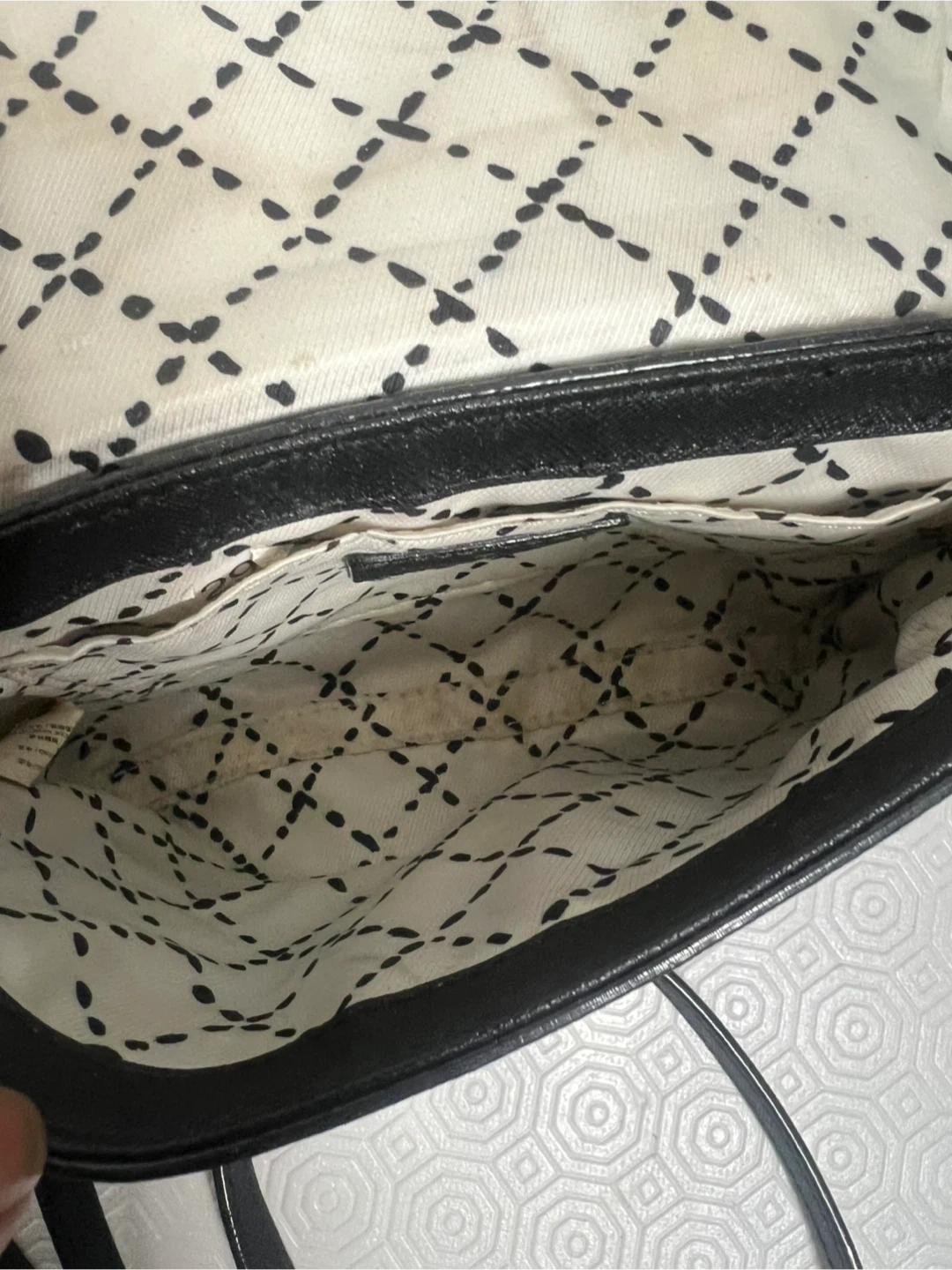 This is a black Kate Spade crossbody bag. It's made of textured leather with a gold-tone turnlock closure and a chain strap. The interior lining has a polka dot pattern.