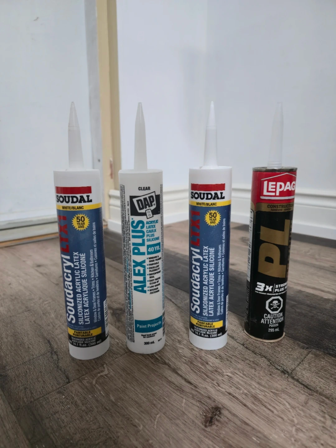 Three tubes of Soudal Soudacryl siliconized acrylic latex caulk. This paintable caulk is suitable for window and door frames, trims, kitchens, and bathrooms. Each tube is 10.1 fl.oz. (300 ml).