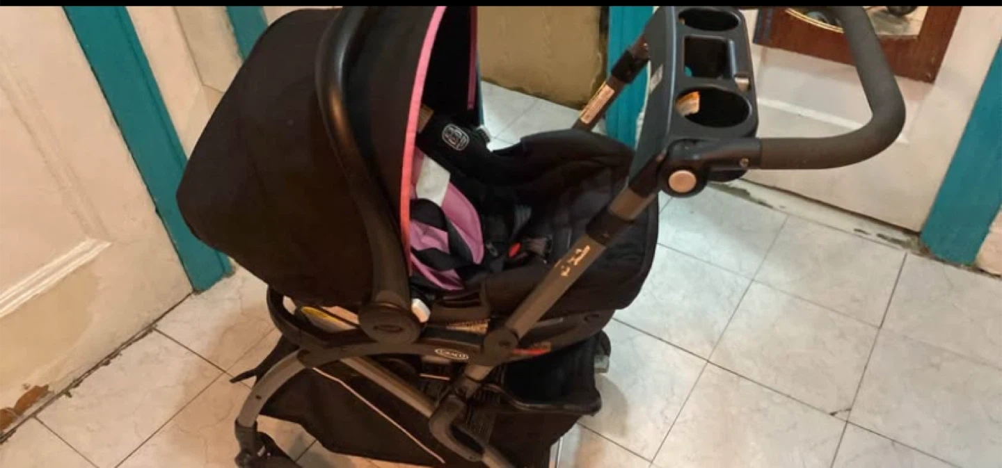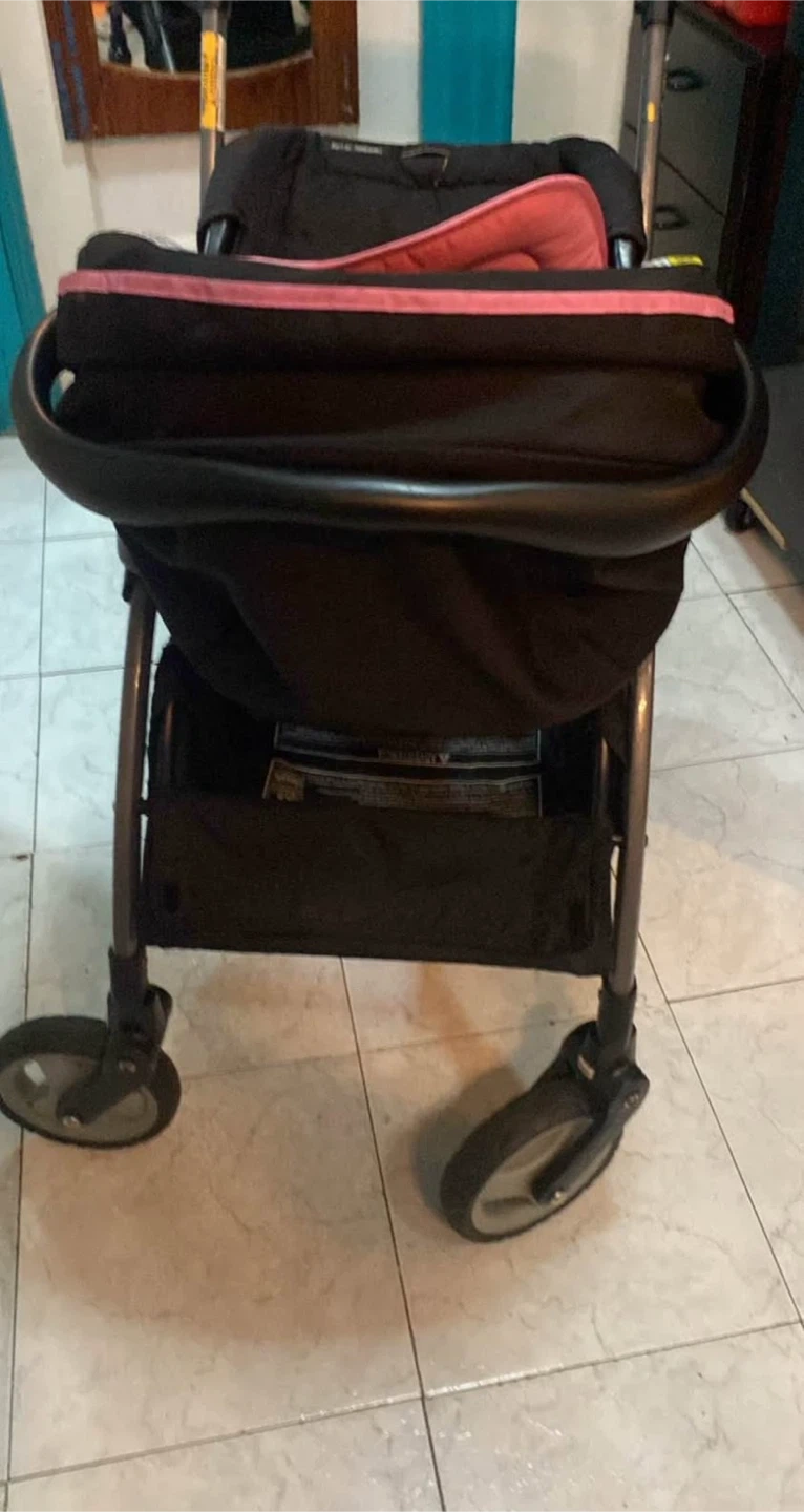 Selling a used Graco stroller in black and pink. It's in good condition and ready for a new family. Perfect for walks in the park or trips to the store!