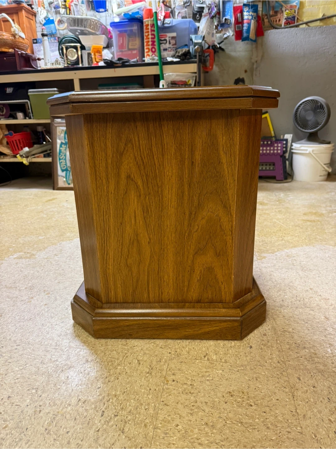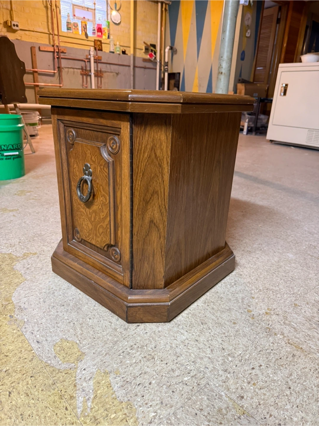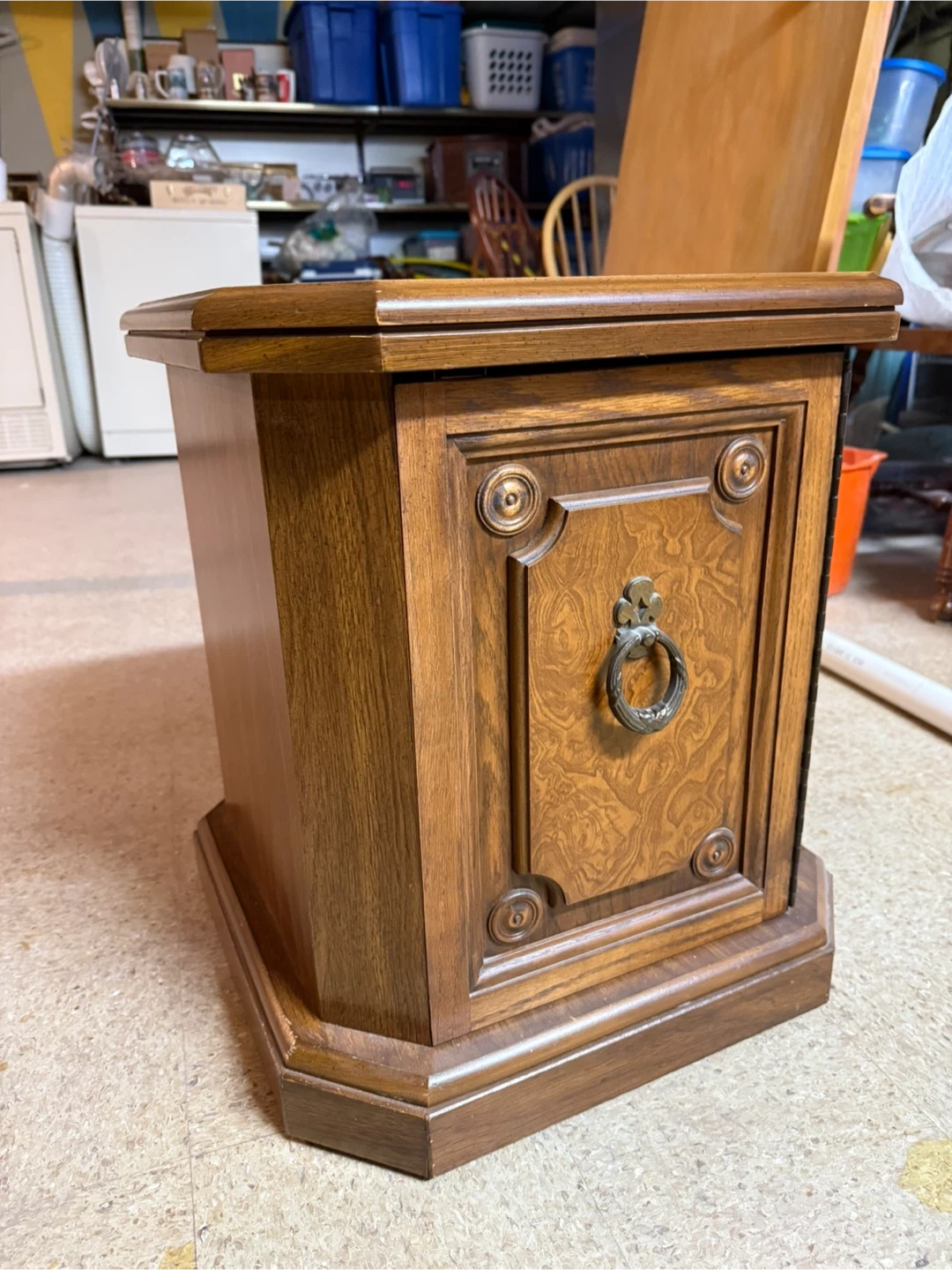 This vintage wooden side table features a single drawer with a decorative pull. Its classic design and rich wood finish make it a charming addition to any room. Perfect for storing small items or placing a lamp on.