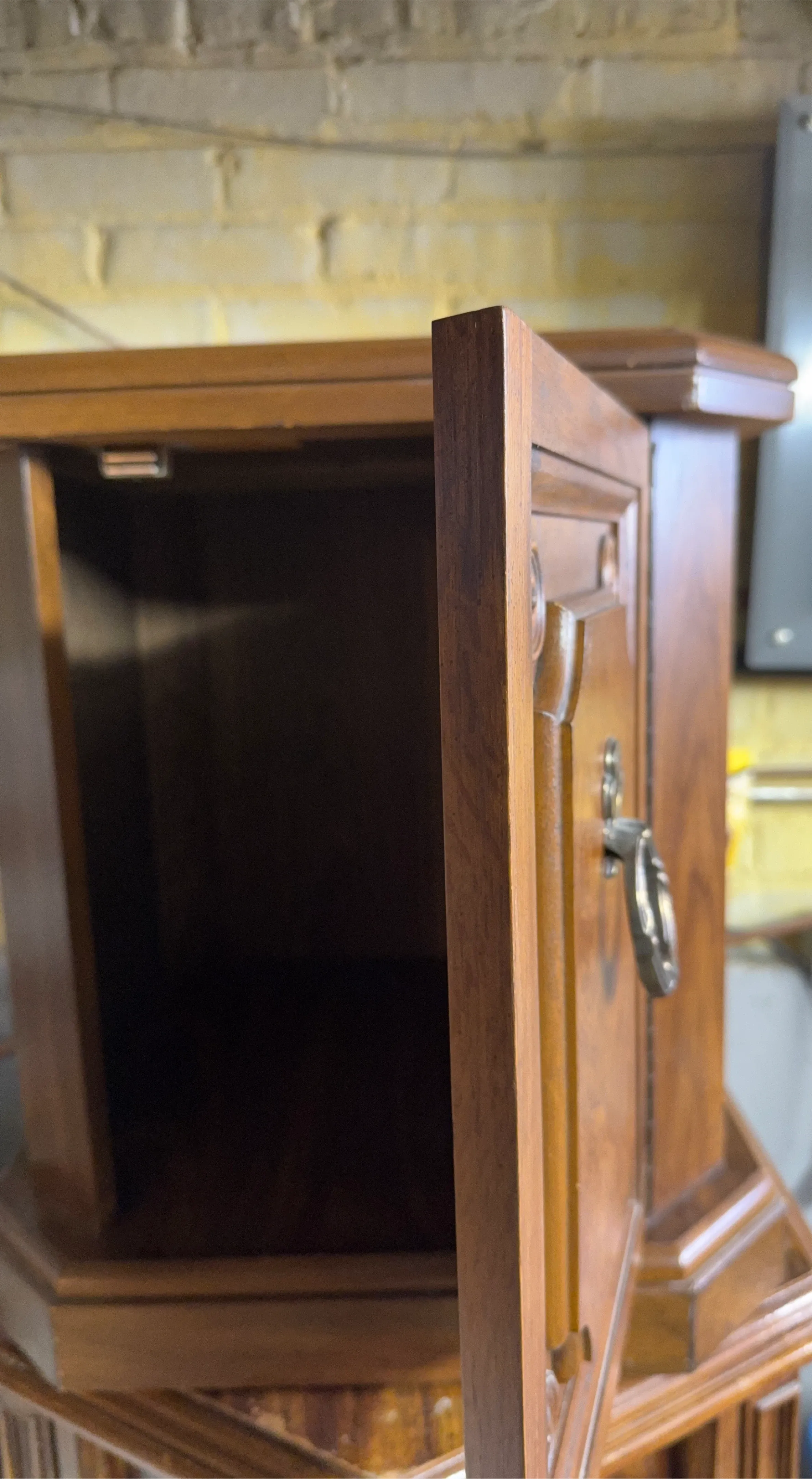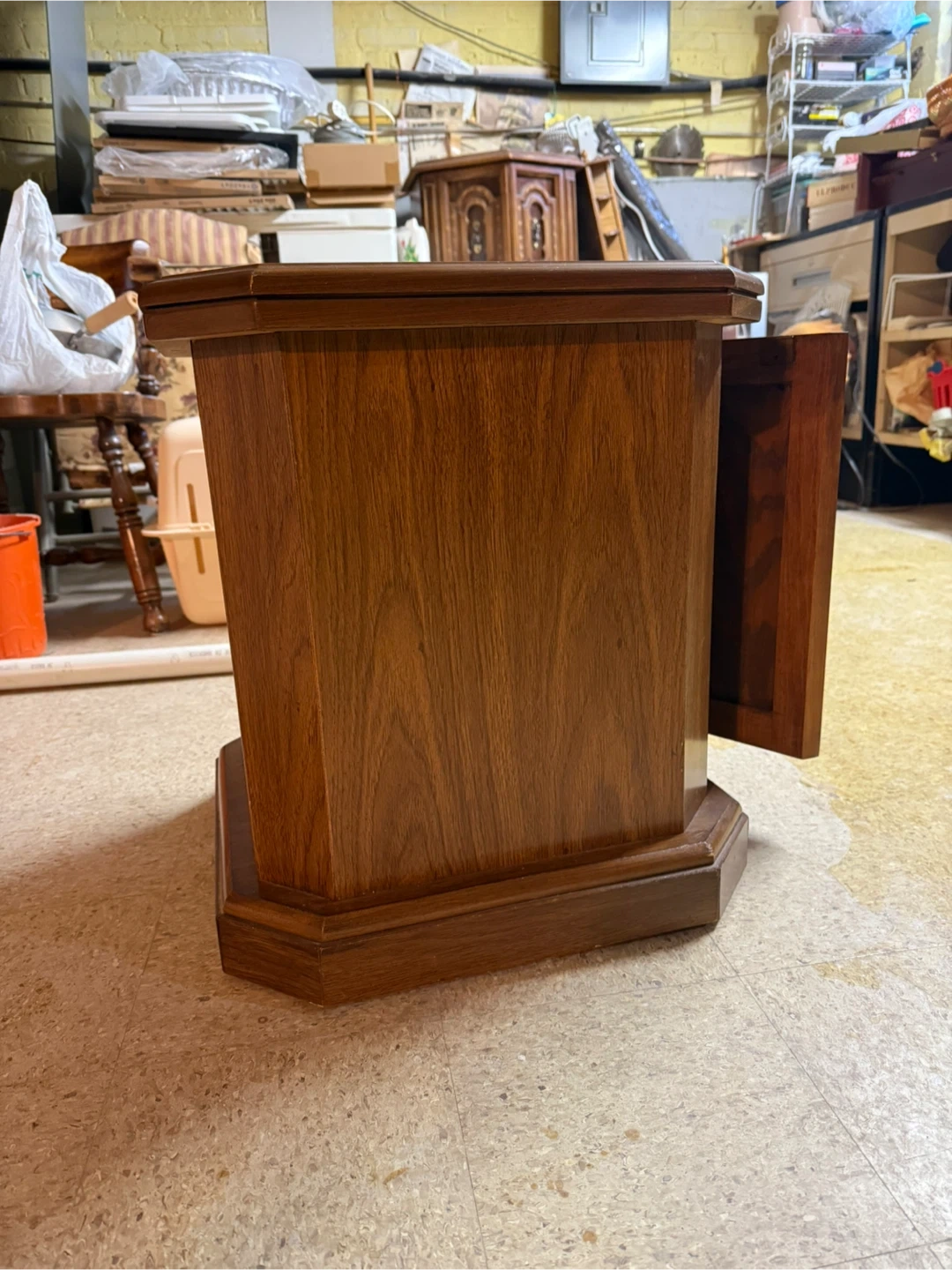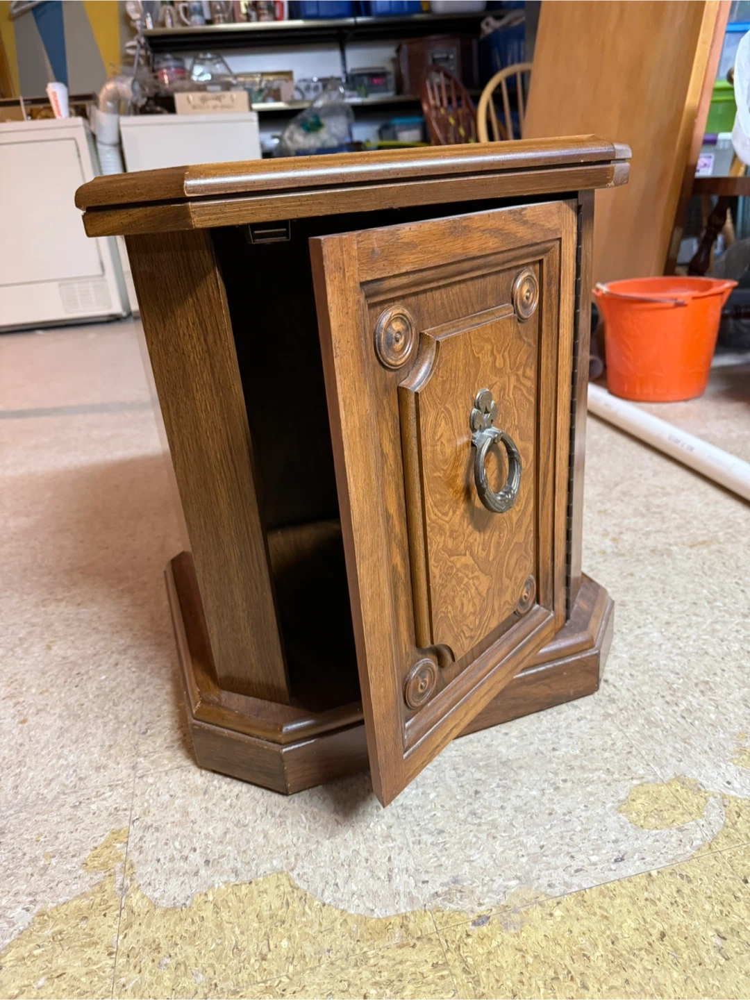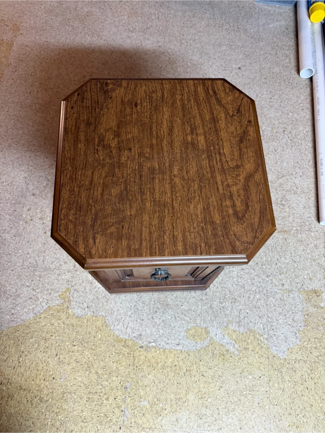 This vintage wooden side table features a single drawer with a decorative pull. Its classic design and rich wood finish make it a charming addition to any room. Perfect for storing small items or placing a lamp on.