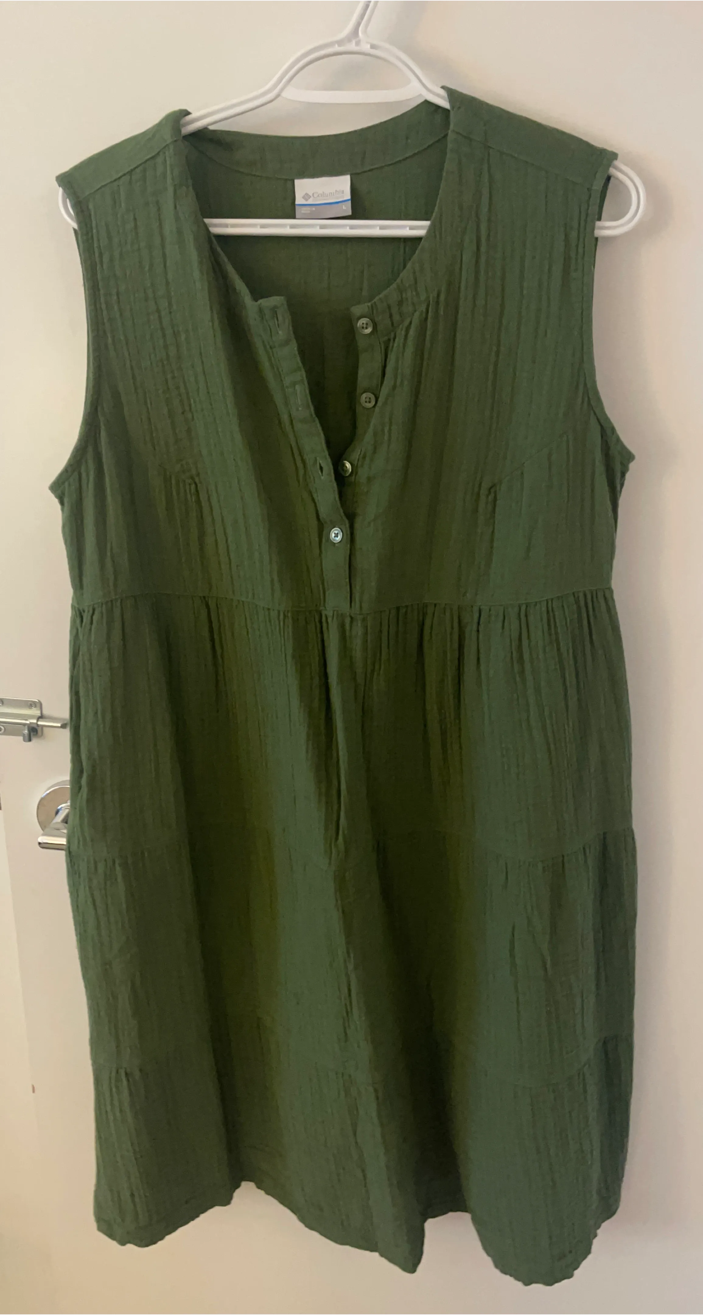 Columbia sleeveless green dress in size large. It features a tiered hem and button-up neckline. This dress is made from a textured fabric.