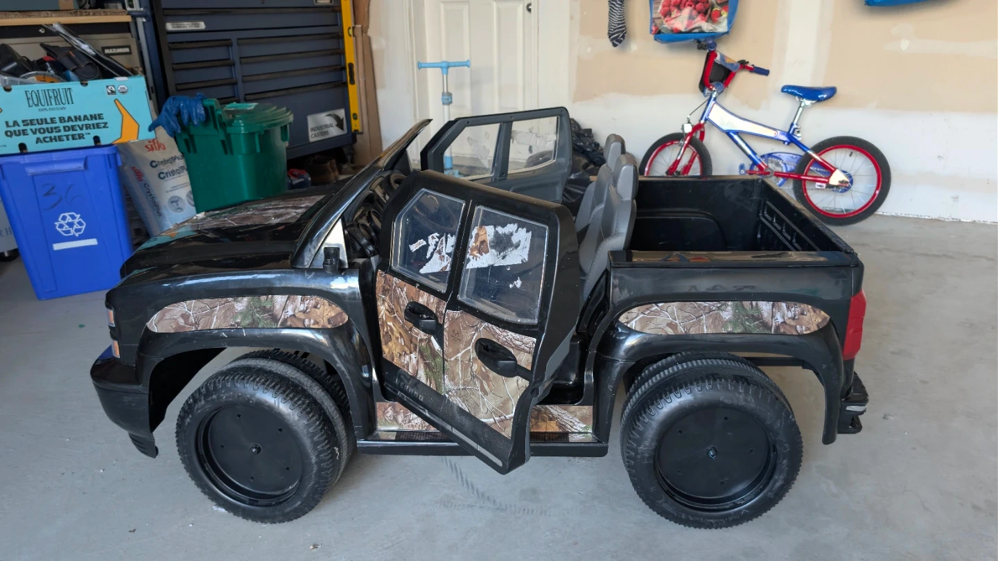 Black Chevrolet Silverado LTZ ride-on truck with camouflage accents. Doors open and close. It features a realistic dashboard and seating for two. Durable plastic construction.