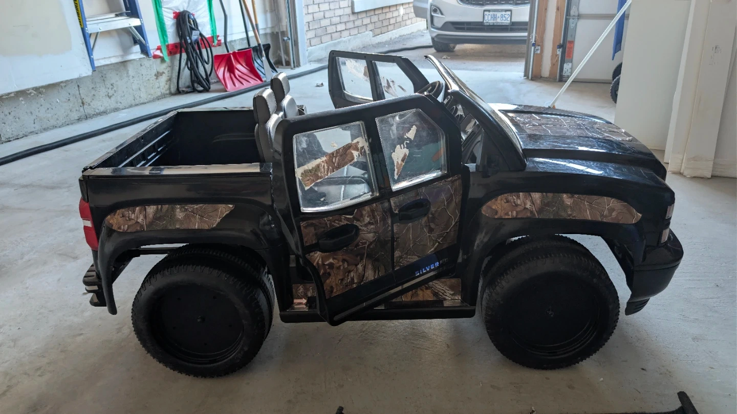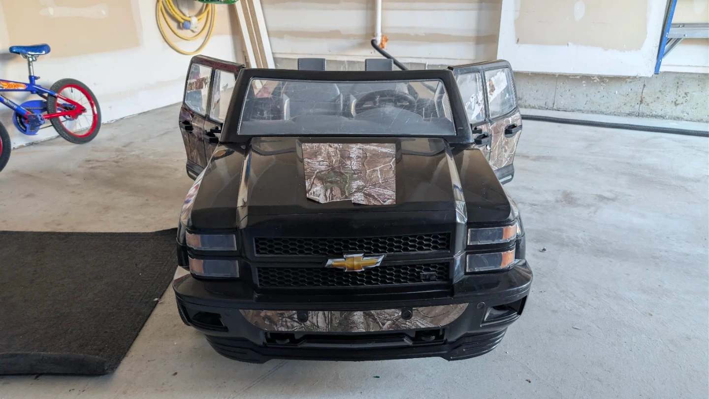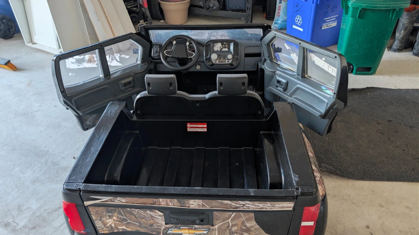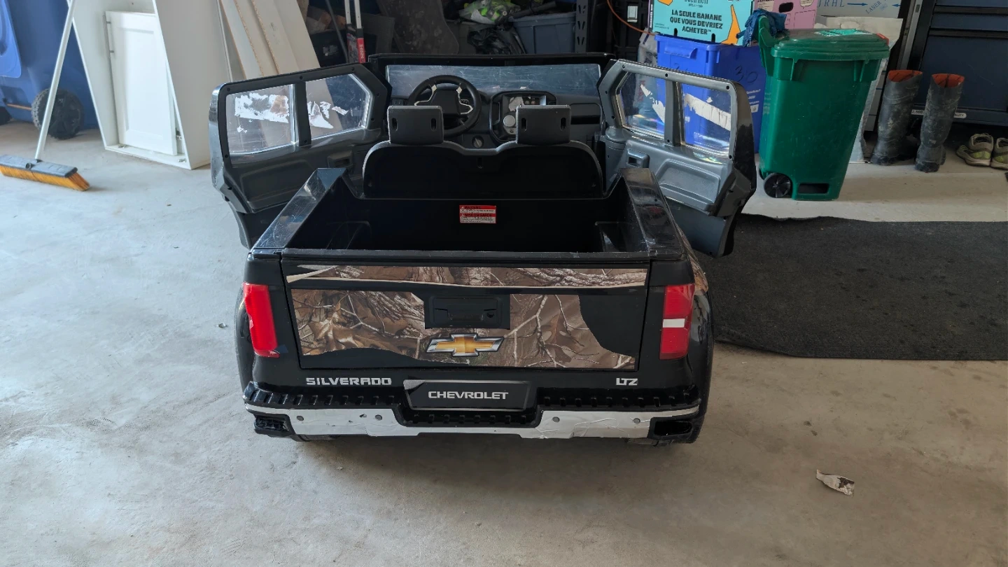 Black Chevrolet Silverado LTZ ride-on truck with camouflage accents. Doors open and close. It features a realistic dashboard and seating for two. Durable plastic construction.