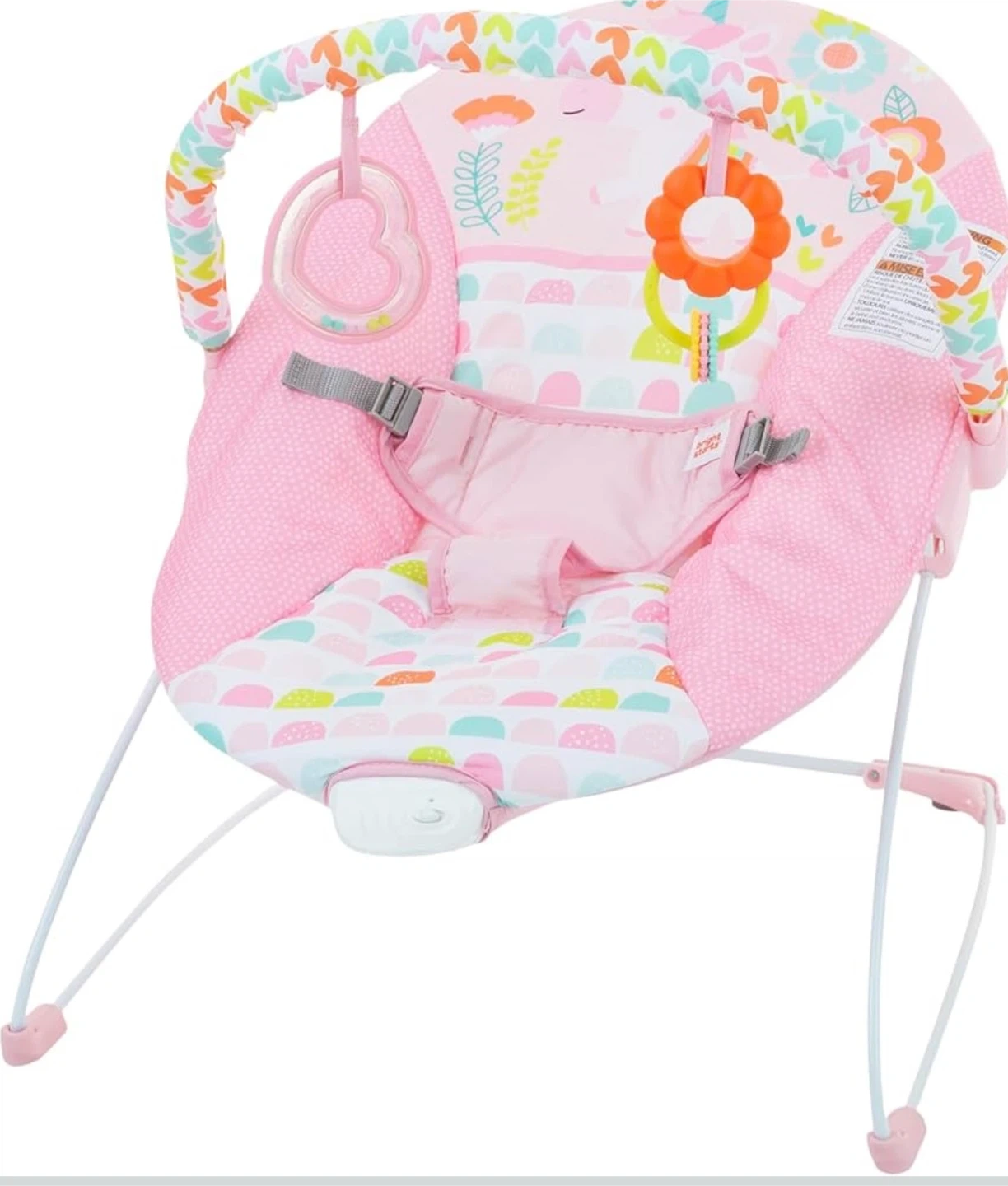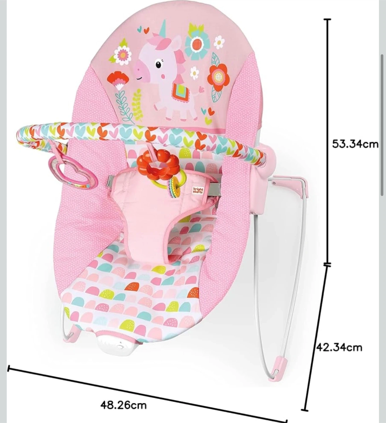 This adorable Bright Starts bouncer is perfect for keeping your little one happy and entertained! The pink unicorn design is super cute, and the bouncer features a toy bar with fun toys to reach for. It's in great condition and ready for a new baby to enjoy!