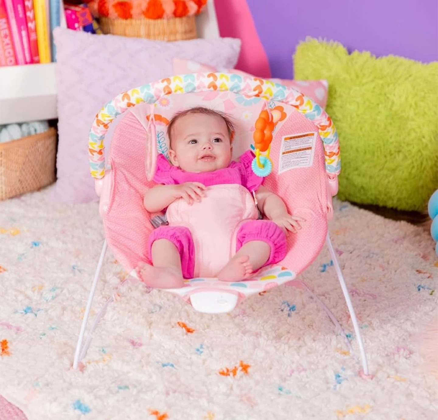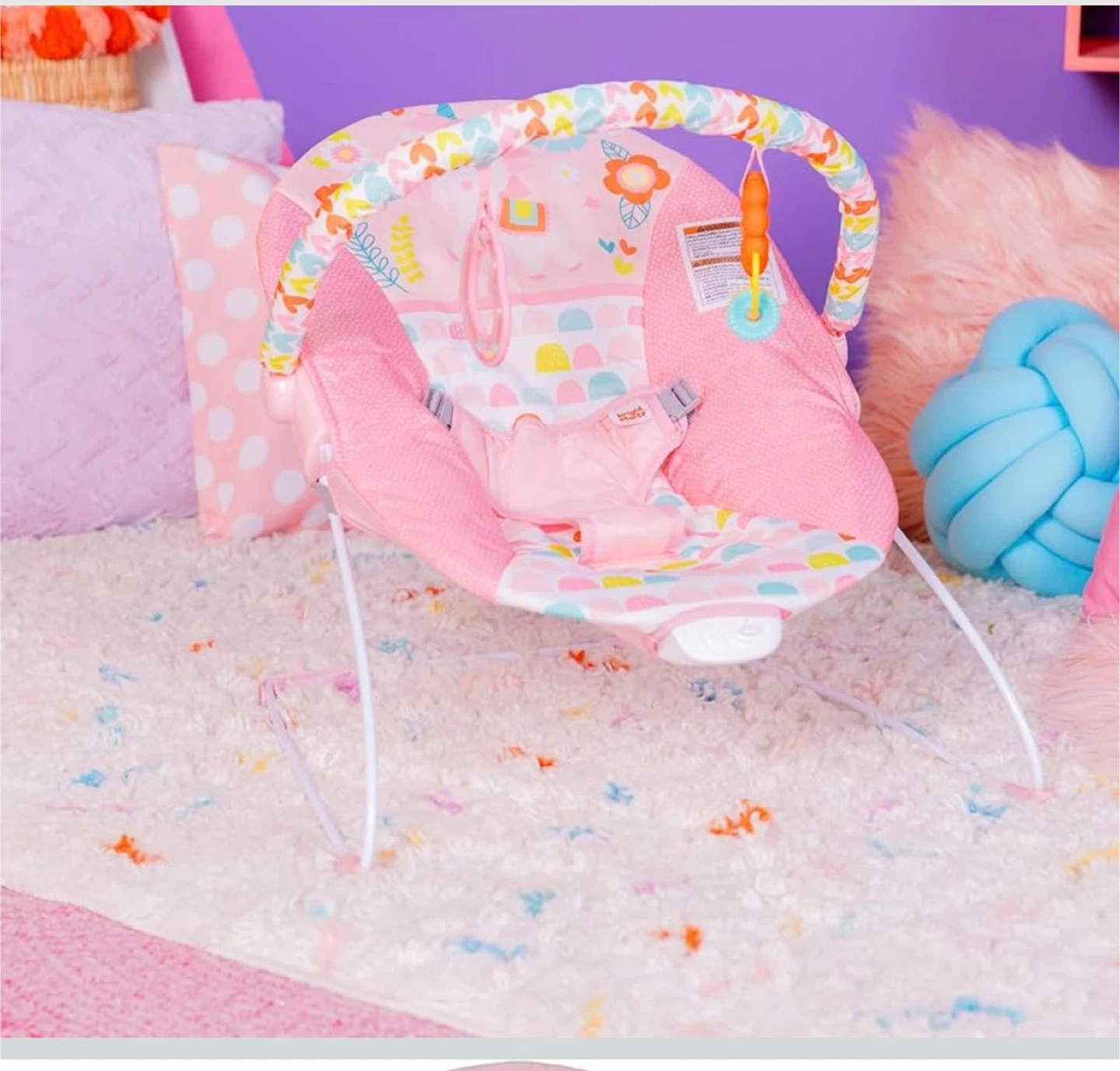 This adorable Bright Starts bouncer is perfect for keeping your little one happy and entertained! The pink unicorn design is super cute, and the bouncer features a toy bar with fun toys to reach for. It's in great condition and ready for a new baby to enjoy!