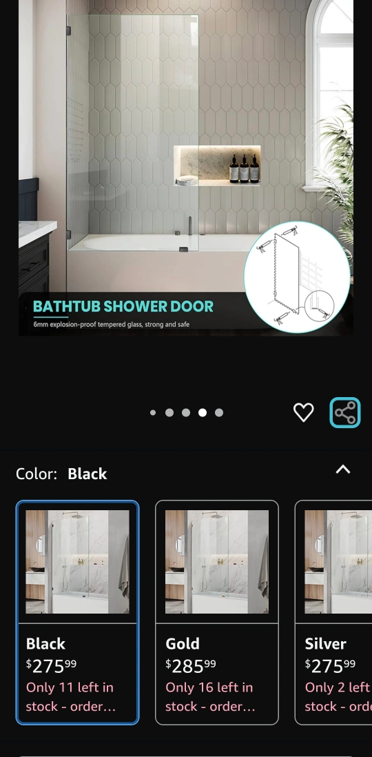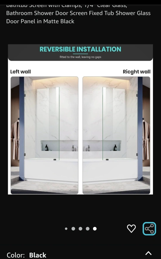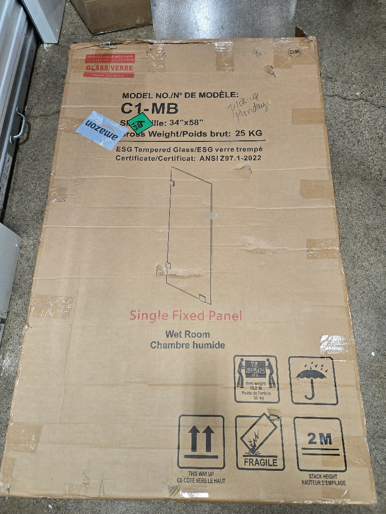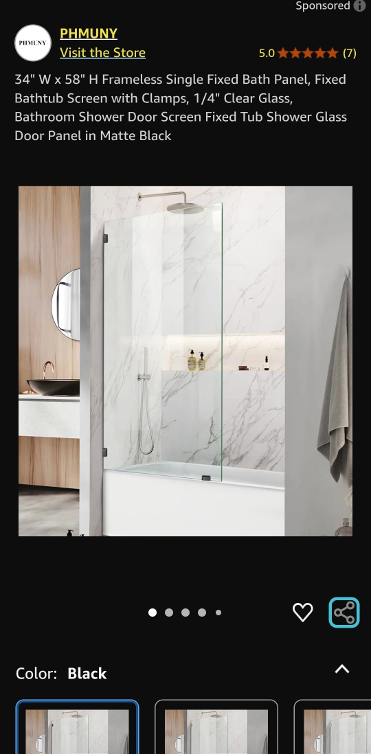 Selling a PHMUNY frameless single fixed bath panel in matte black. The size is 34" W x 58" H. It's a fixed bathtub screen with clamps and is made of 1/4" clear glass. It's still in the box!