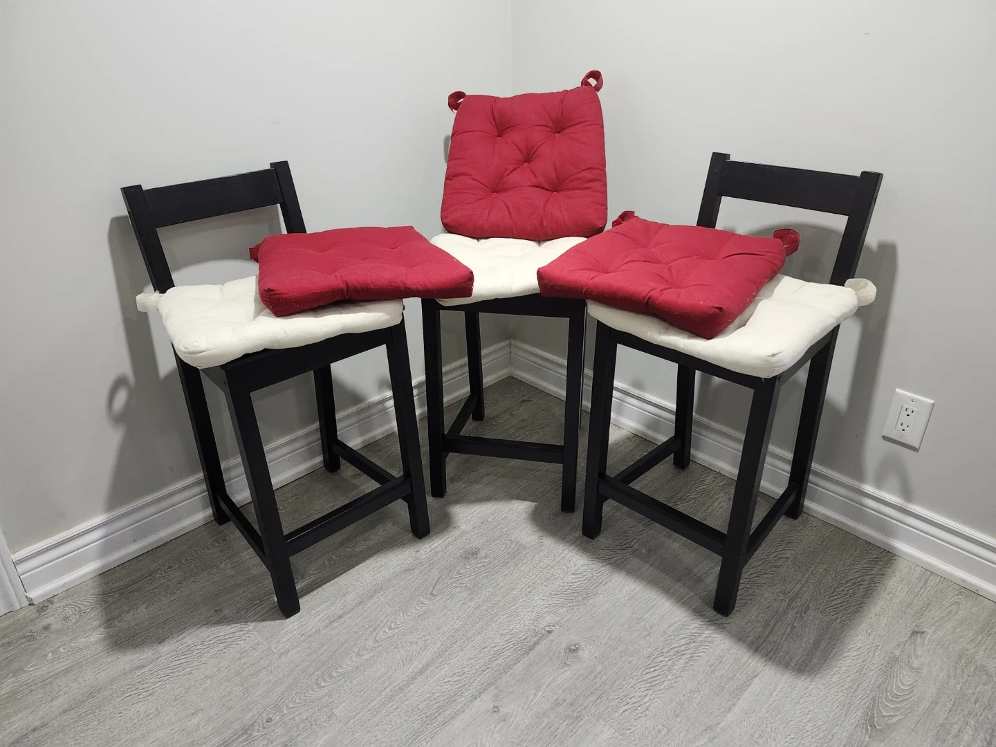 Set of three black wooden bar stools. Includes three white seat cushions and three red seat cushions. Perfect for a kitchen island or home bar. Brand Ikea. Set price.