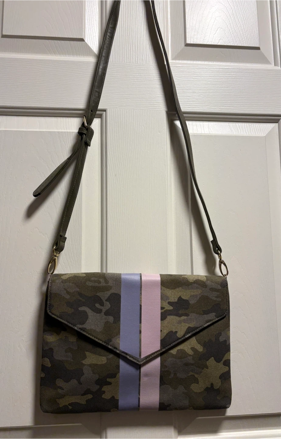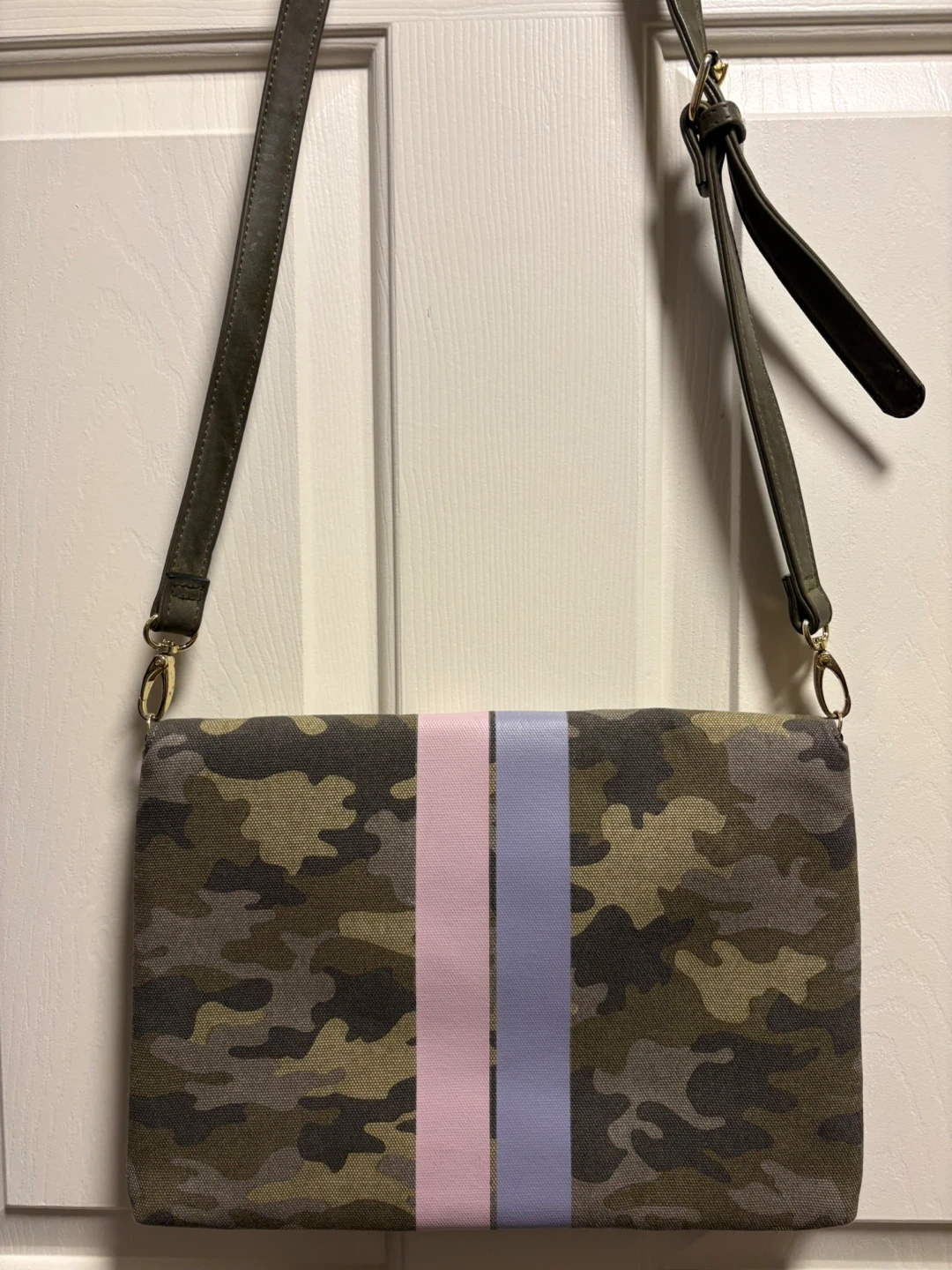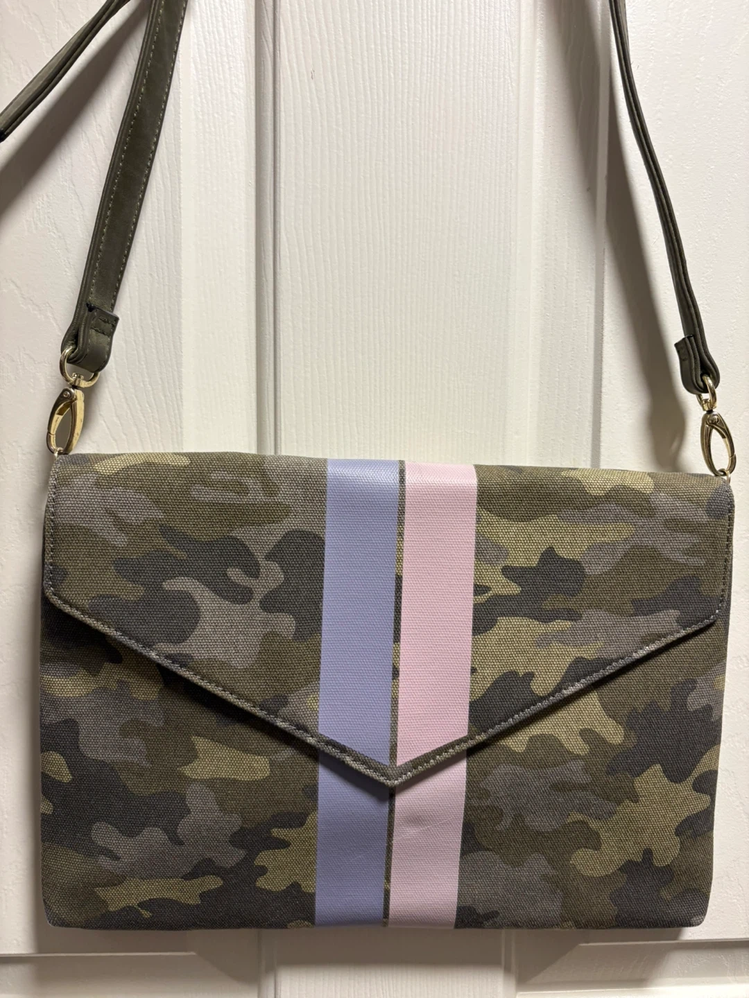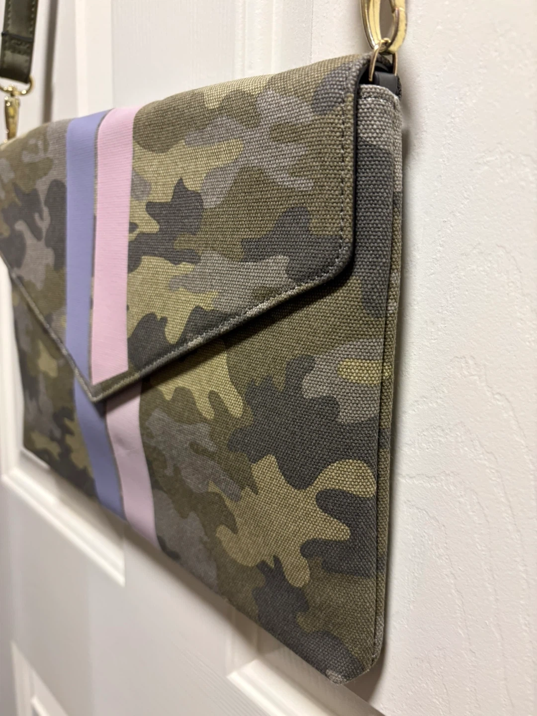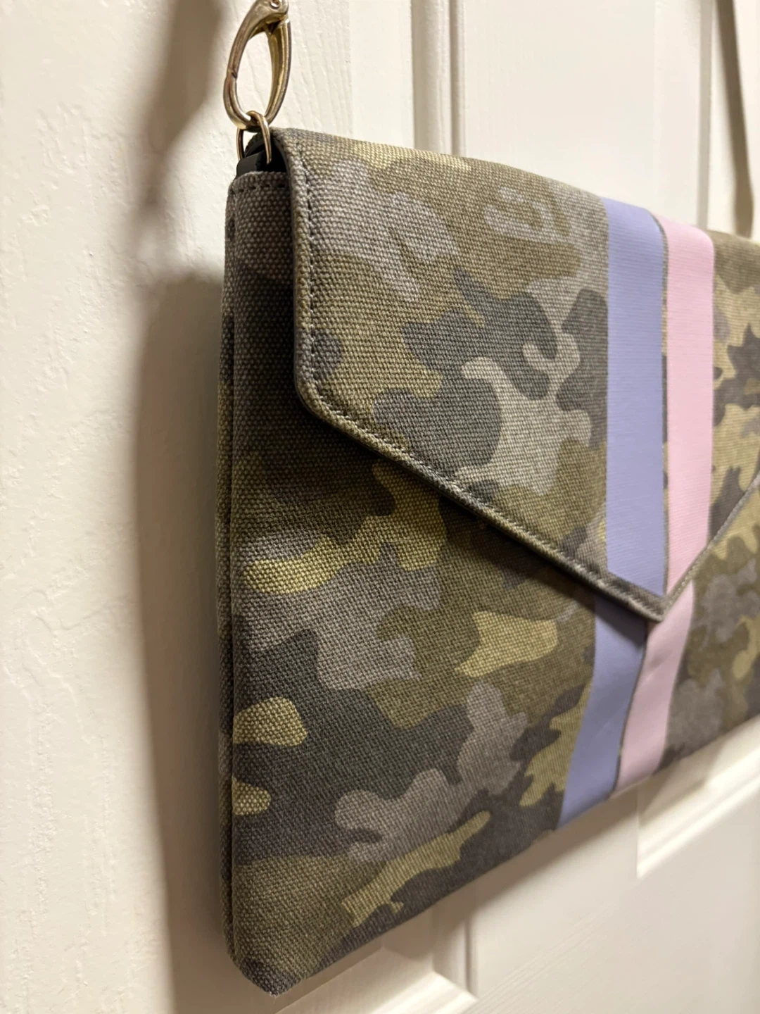 This is a stylish Stella & Dot Bellamy camouflage clutch purse. It features vertical stripes in pink and light purple on the flap closure. The purse has a canvas-like material. It includes a detachable strap. New condition, never been used! Pick up in Chestermere.