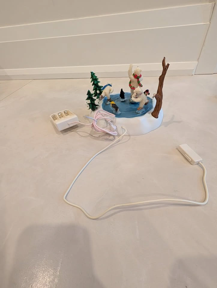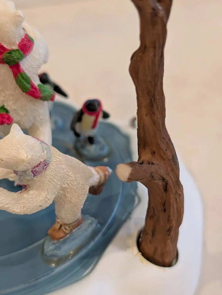Please note: it lights up, but the skating rink does not move for some reason. When turned on, you can hear the motor working. Additionally, one of the tree branches broke in half, so the tree arm is shorter. Plus one part of the cord has a pink tint to it.