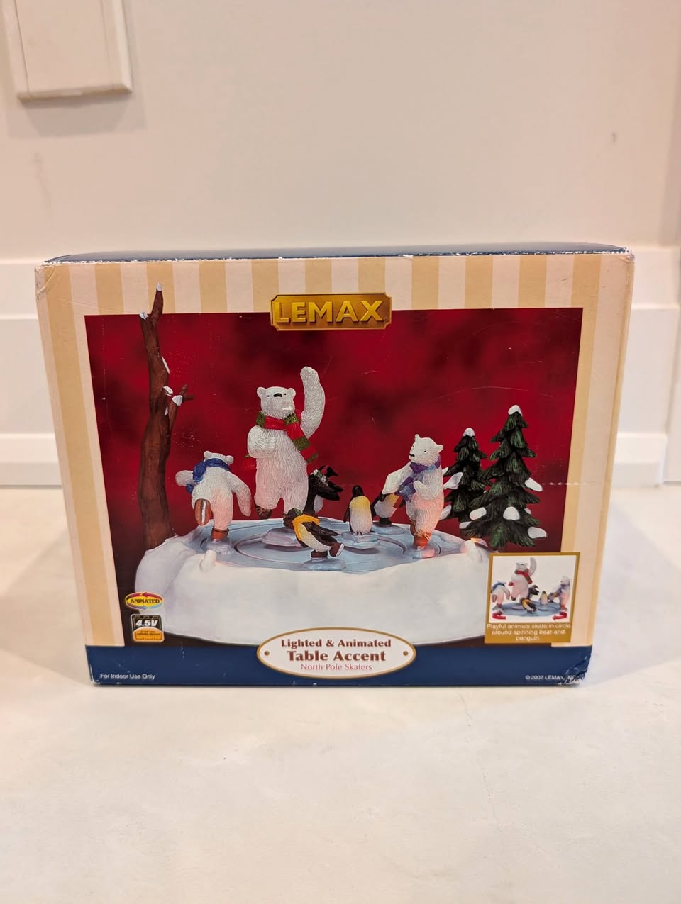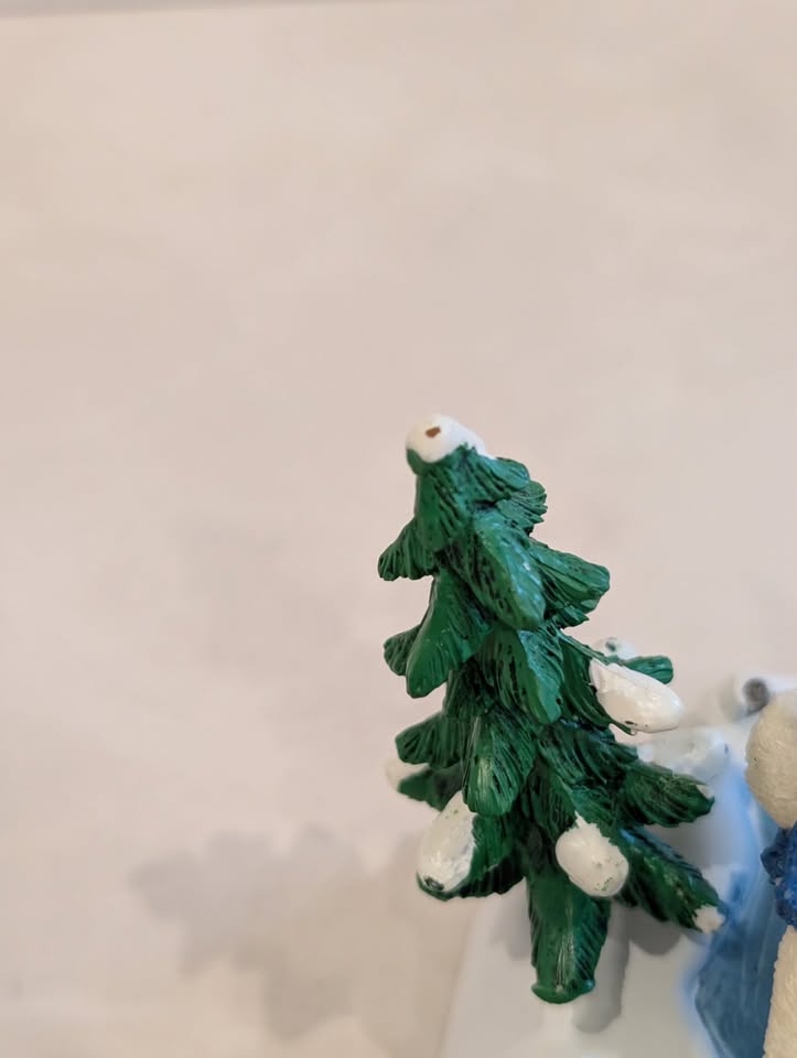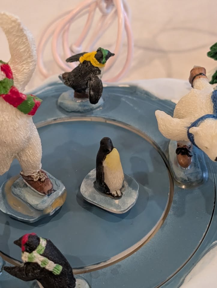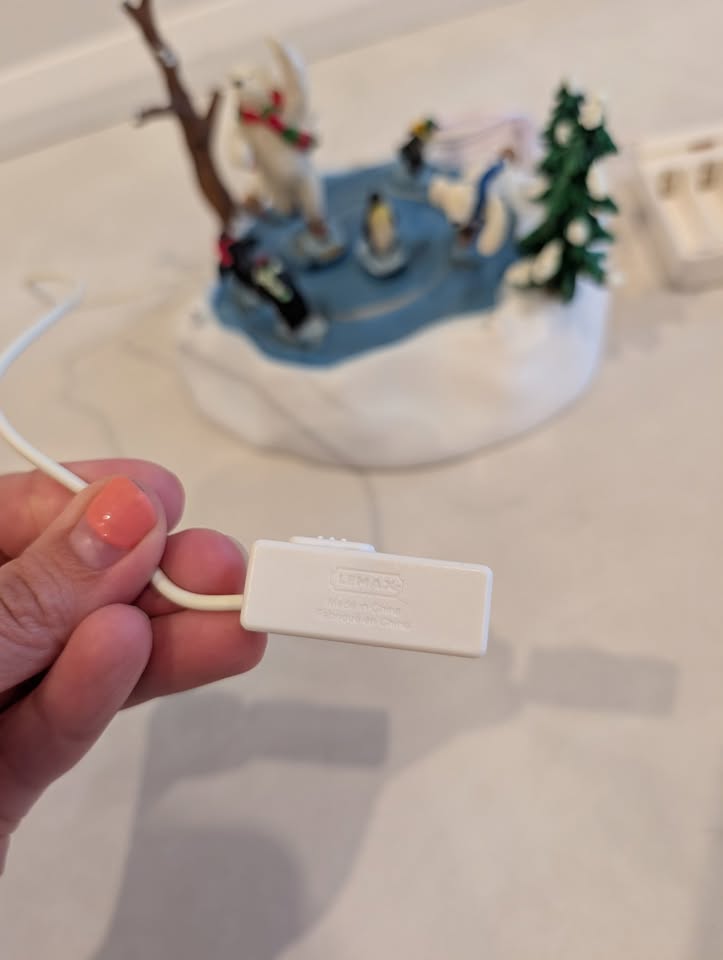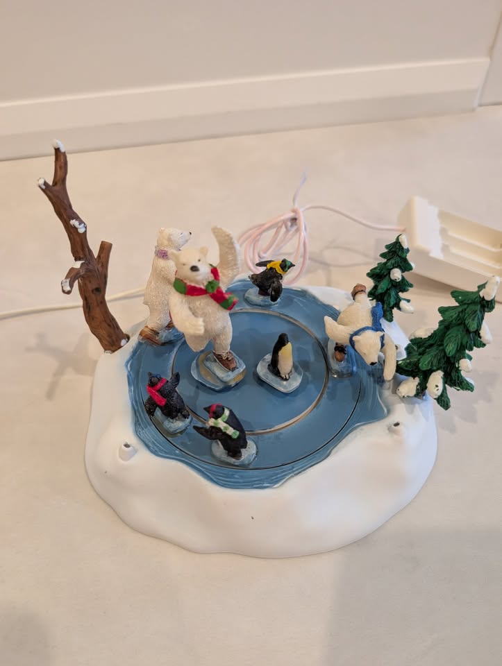 Please note: it lights up, but the skating rink does not move for some reason. When turned on, you can hear the motor working. Additionally, one of the tree branches broke in half, so the tree arm is shorter. Plus one part of the cord has a pink tint to it.