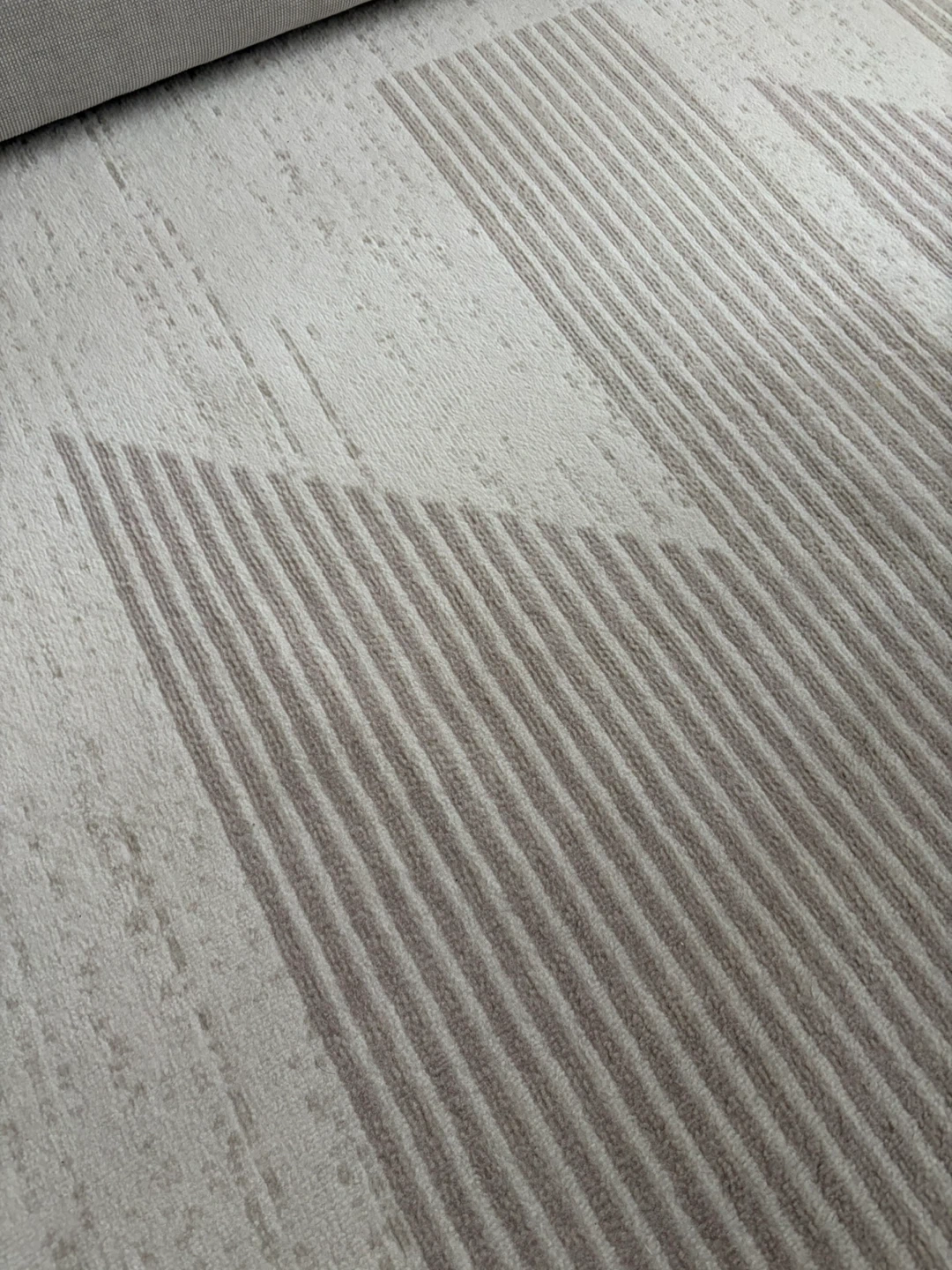 This area rug features a modern design with neutral-toned stripes and subtle geometric accents. Its soft texture makes it a comfy addition to any living space. Great for adding warmth and style to your home!