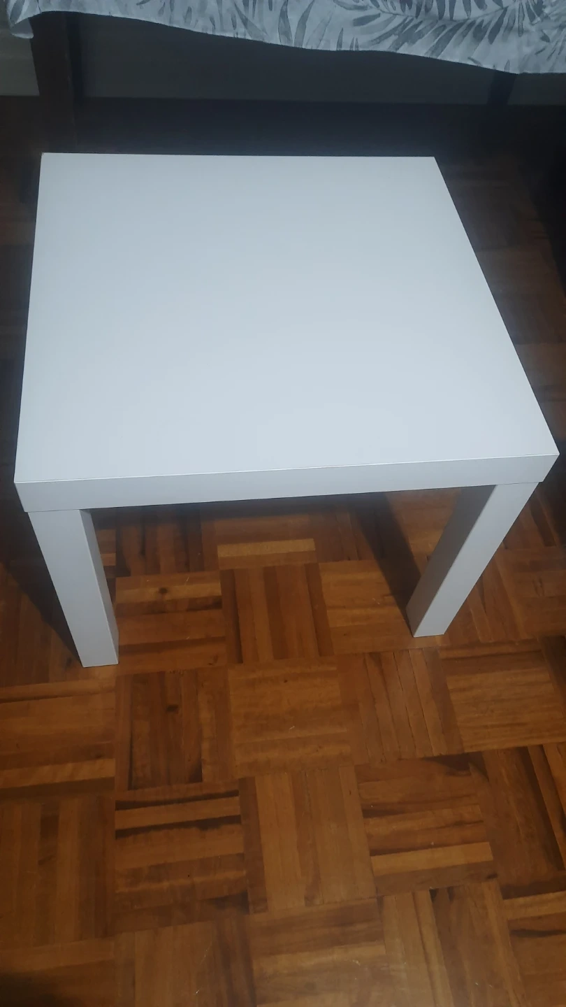 White coffee table. Simple and clean design. It's a square shape and stands on four sturdy legs. Perfect for a living room!