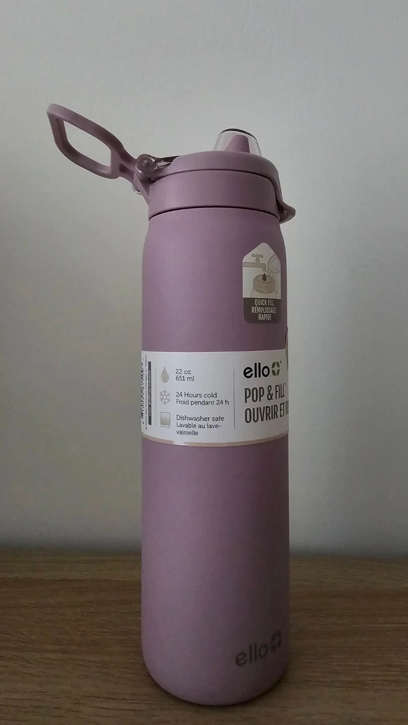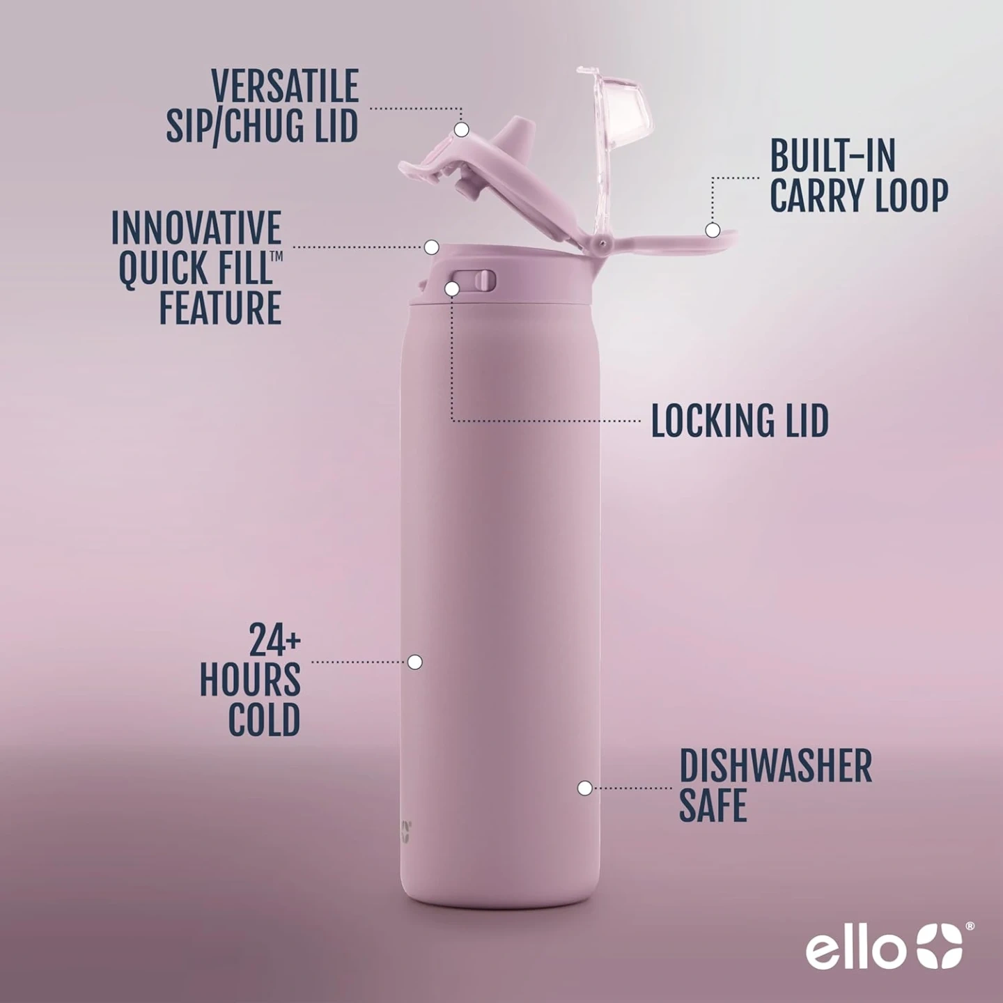 This Ello water bottle holds 22 oz (651 ml) of liquid. It's designed for quick filling and has a leak-proof lid. The bottle keeps drinks cold for 24 hours and is dishwasher safe.