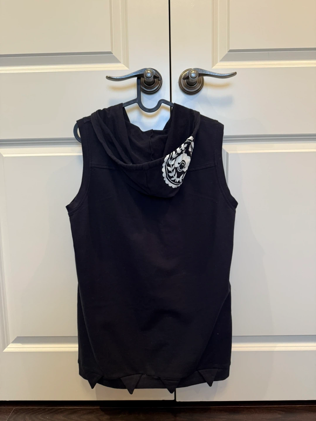Black sleeveless zip-up hoodie with fun graphic details on the front. Features a hood with drawstrings, front pockets, and a relaxed fit.