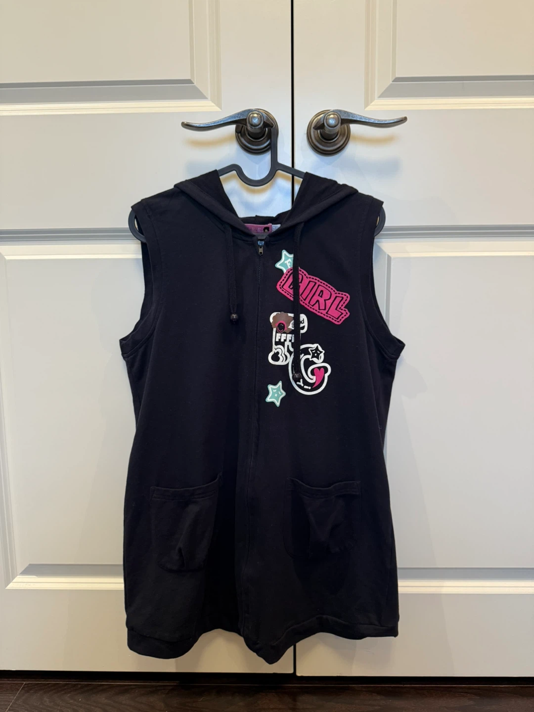 Black sleeveless zip-up hoodie with fun graphic details on the front. Features a hood with drawstrings, front pockets, and a relaxed fit.