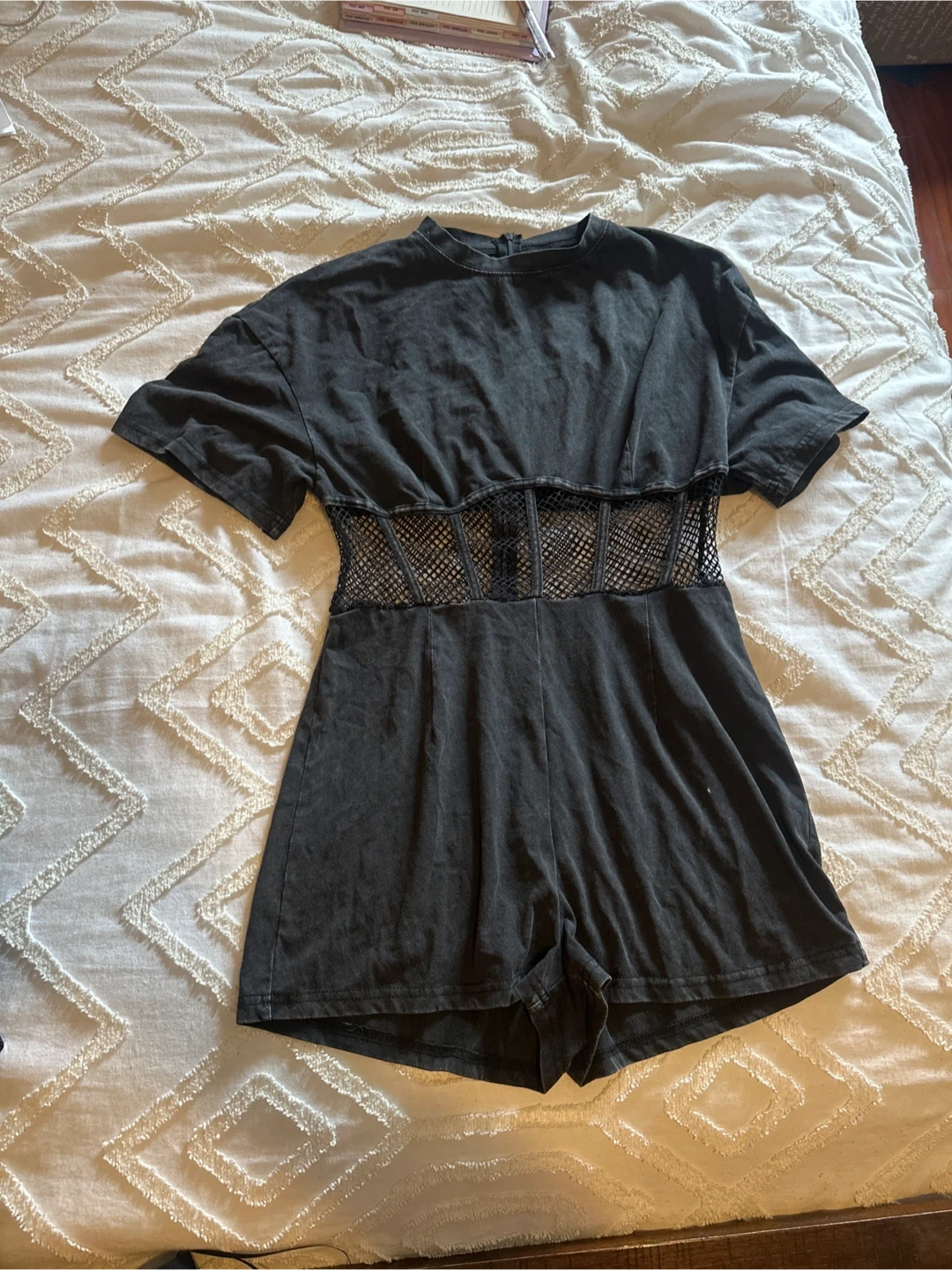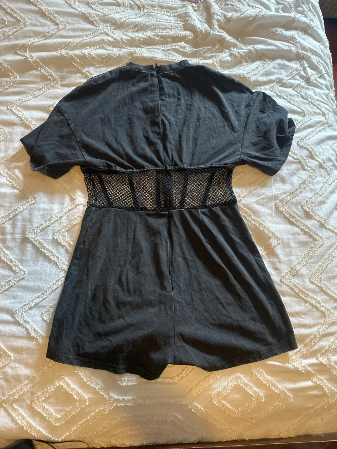 It's a stylish black t-shirt romper featuring a unique mesh waist detail. The fabric appears to be a soft, washed cotton blend. Short sleeves and a zip closure at the back. SHEIN