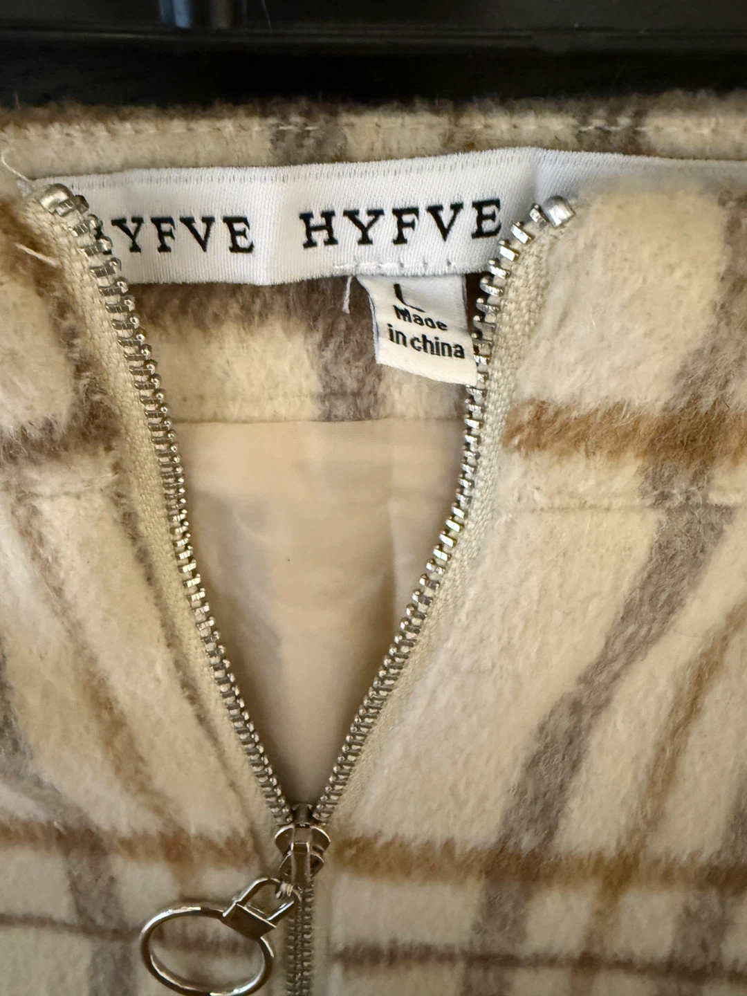 Here's a cute HYFVE mini skirt in a plaid pattern! It's a size L and made of a blend of 90% polyester and 10% wool for the self, with a 100% polyester lining. The style number is HF20H193.
