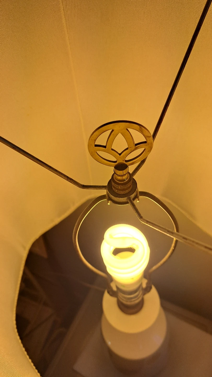 This vintage ceramic table lamp features a white base with a gold snowflake pattern. It has a gold trim at the base and neck. Includes a white fabric lampshade with scalloped edges and gold trim. Perfect for adding a touch of retro charm to any room!