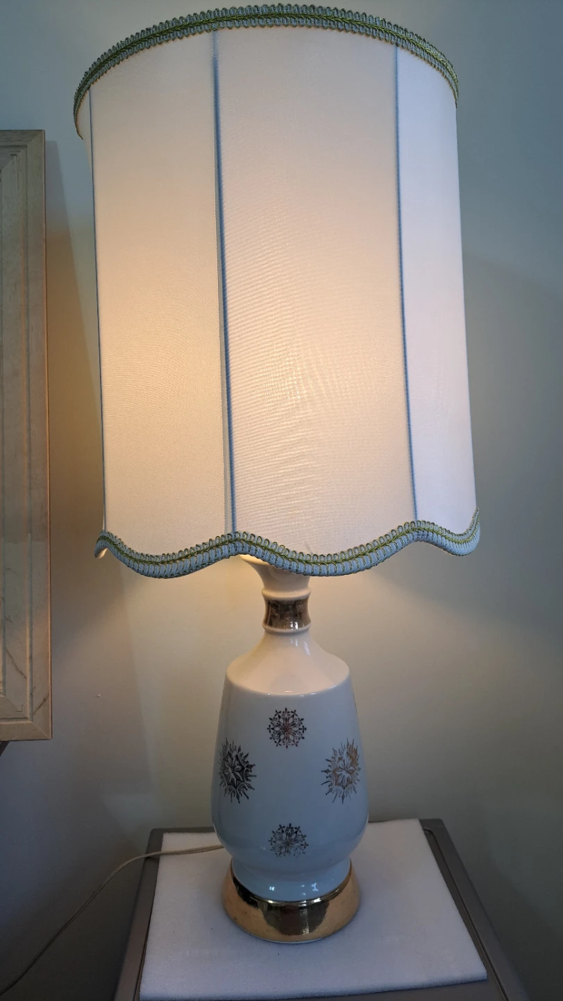 This vintage ceramic table lamp features a white base with a gold snowflake pattern. It has a gold trim at the base and neck. Includes a white fabric lampshade with scalloped edges and gold trim. Perfect for adding a touch of retro charm to any room!