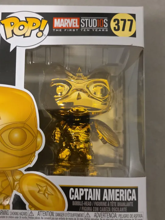 Selling a Funko Pop! figure of Captain America from the Marvel Studios: The First Ten Years collection. This is figure #377 and is a bobble-head.