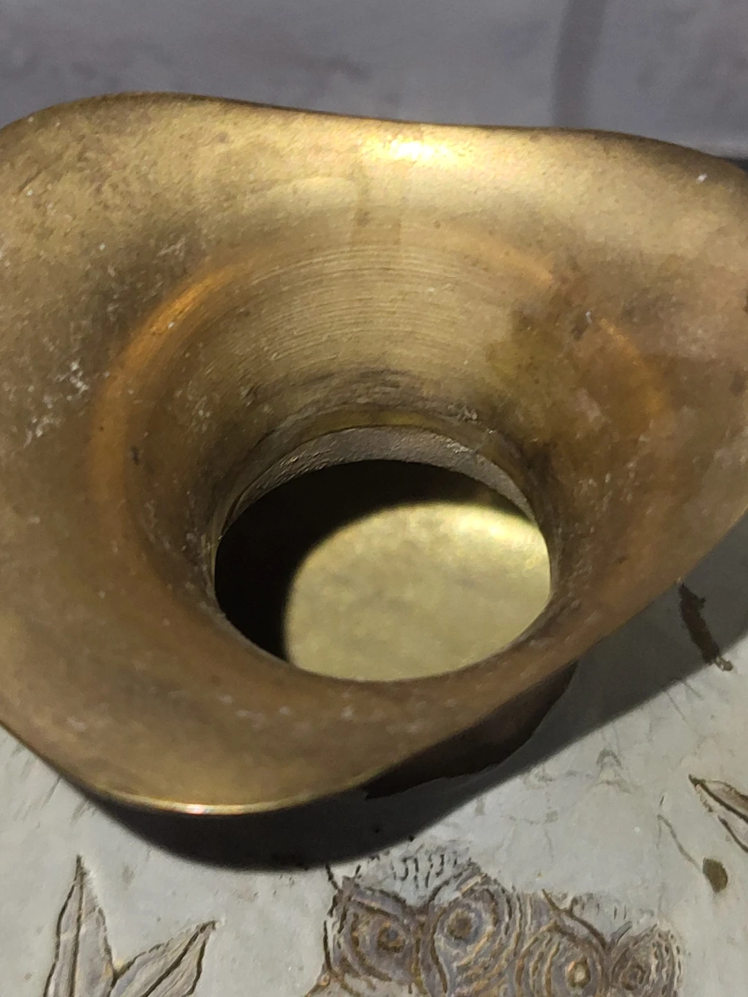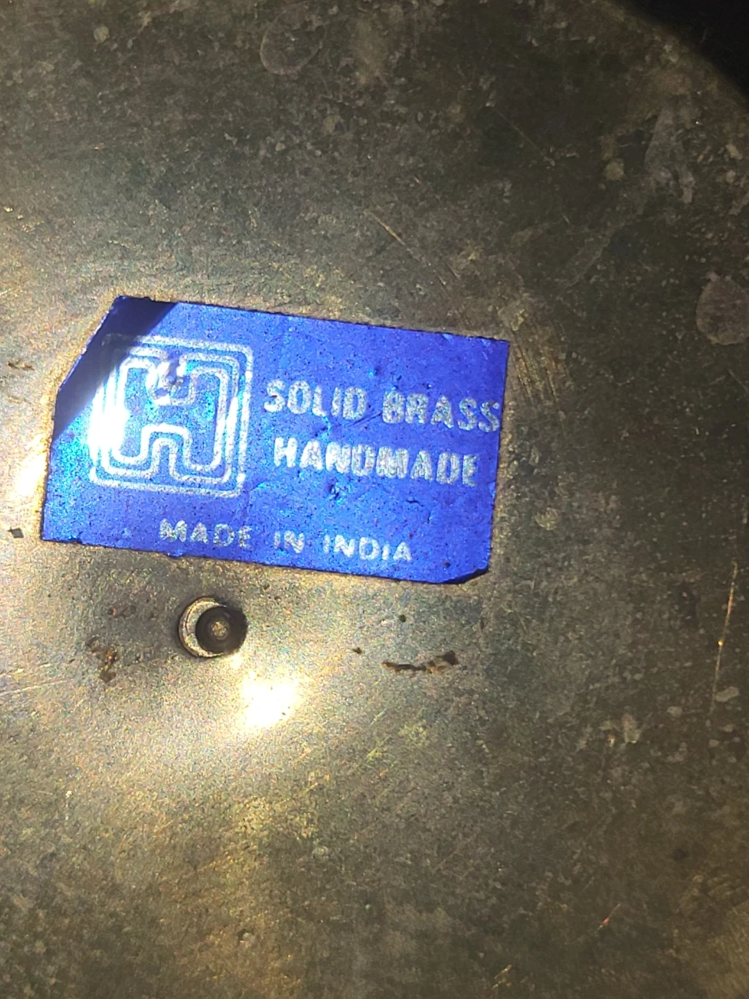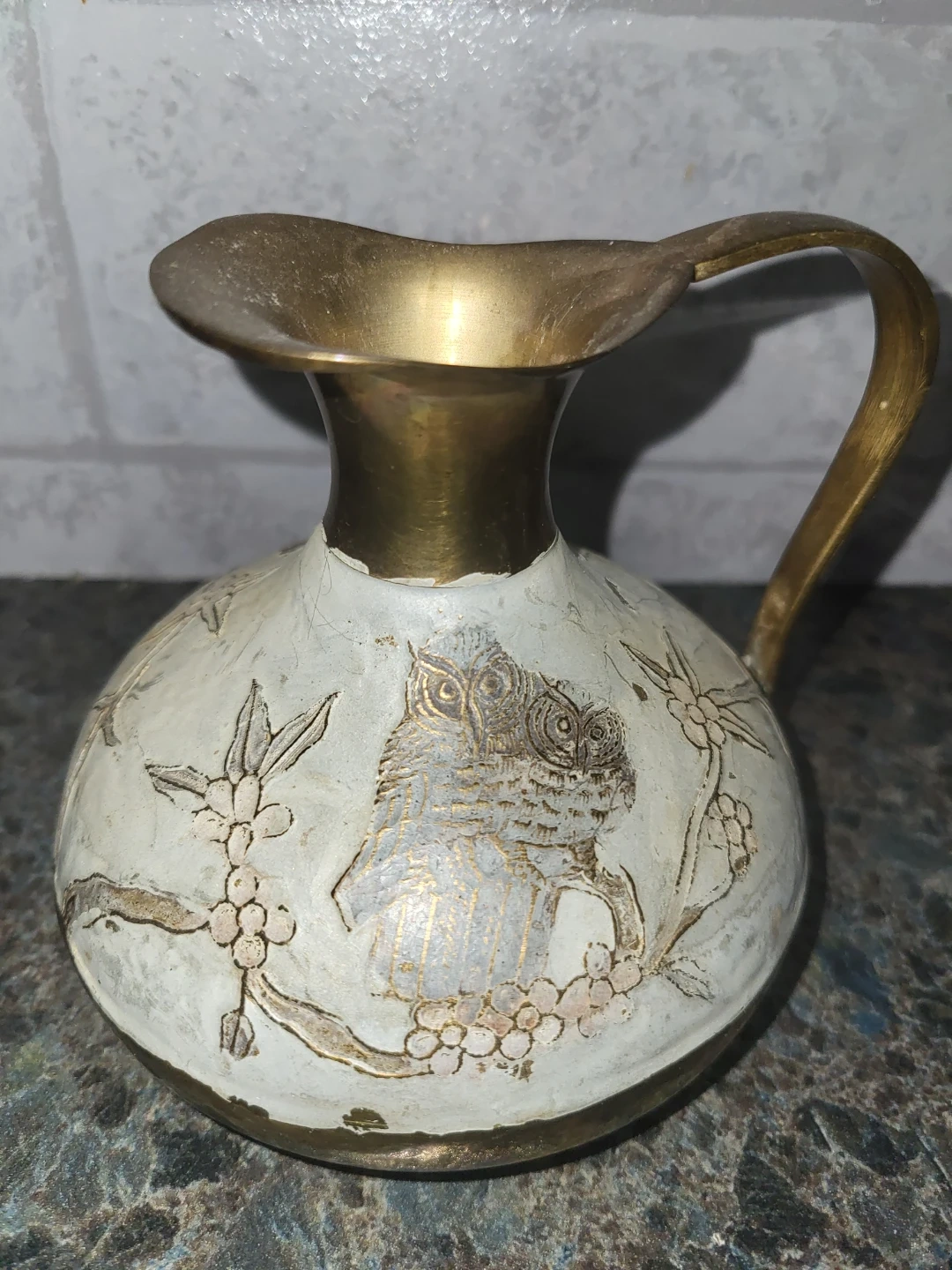 This is a solid brass jug, handmade in India. It features an etched owl design with floral accents. The jug has a brass spout and handle.