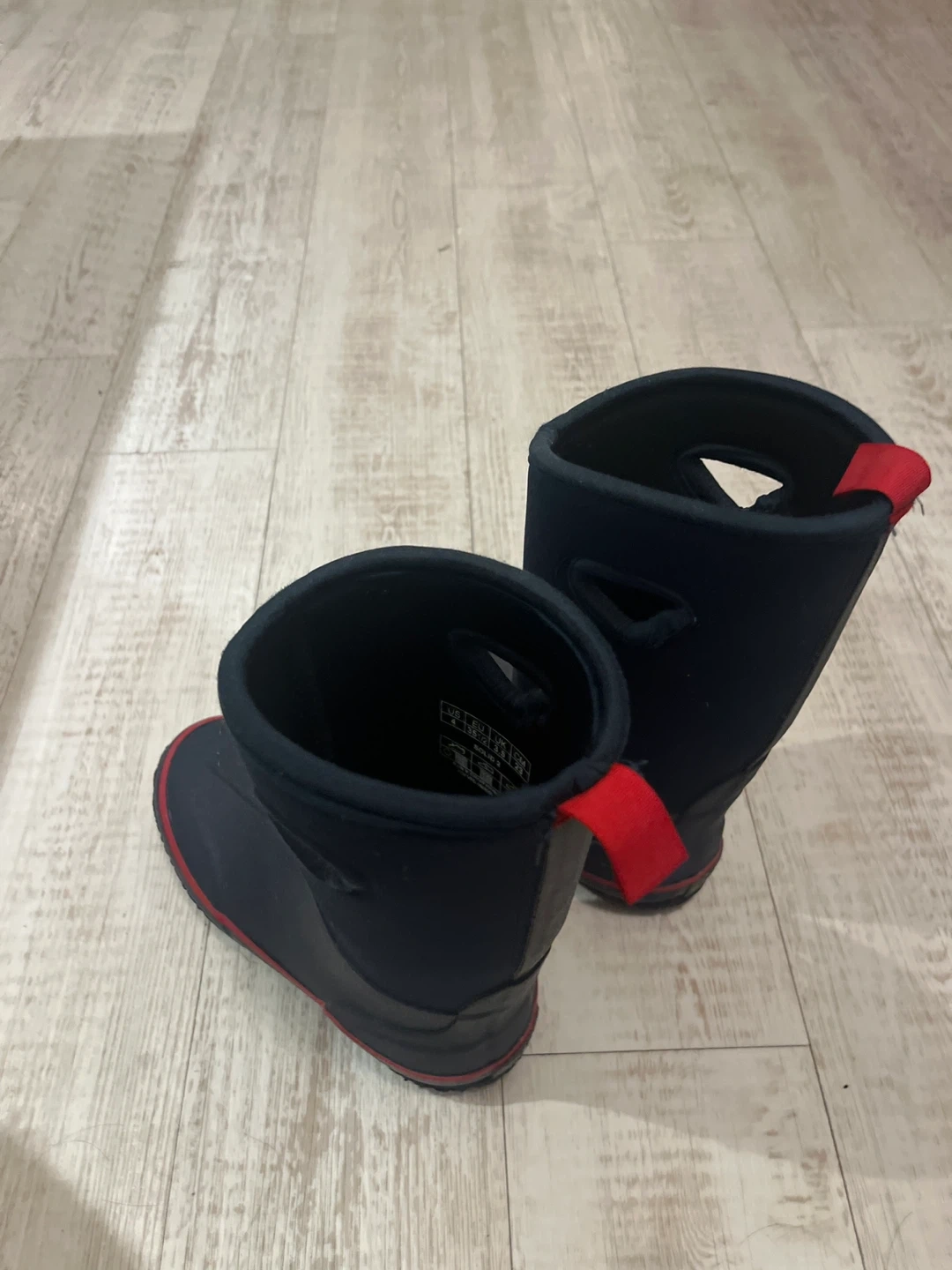 Dark blue Bogs kids boots with red pull tabs. These insulated boots are waterproof. Great for muddy or wet weather!