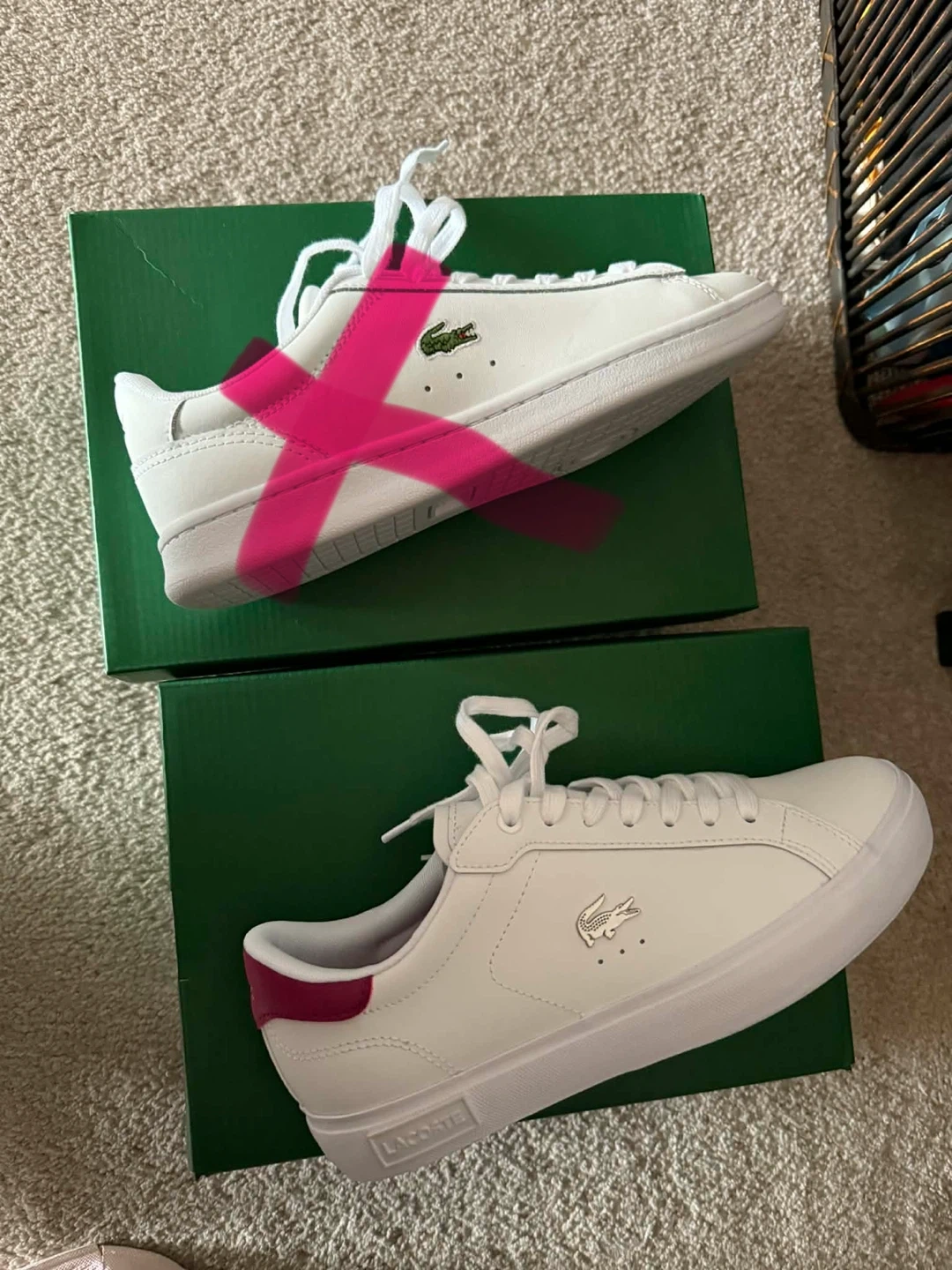 White Lacoste sneakers with a small burgundy accent on the heel, features the signature Lacoste crocodile logo. The shoes come with laces and are in their original boxes. They're made of leather.